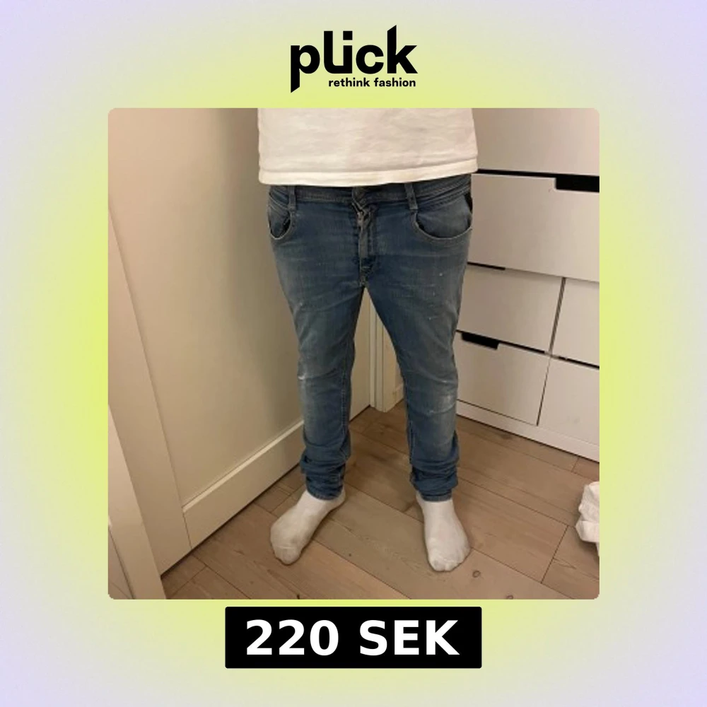 Säljer ett par blå jeans från Replay med snygg tvätt och klassiska fem fickor. Jeansen har tapered passform och normal midja, med diskreta slitningar för en avslappnad look. Har en slitning vid rumpan men det är inget man märker.