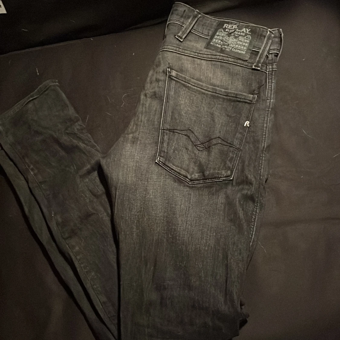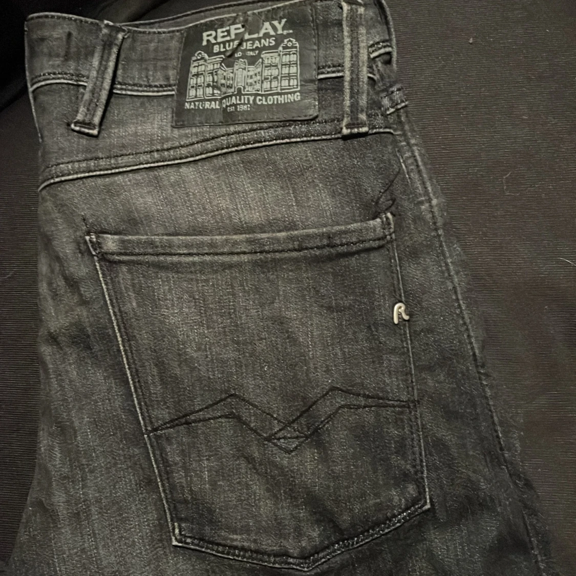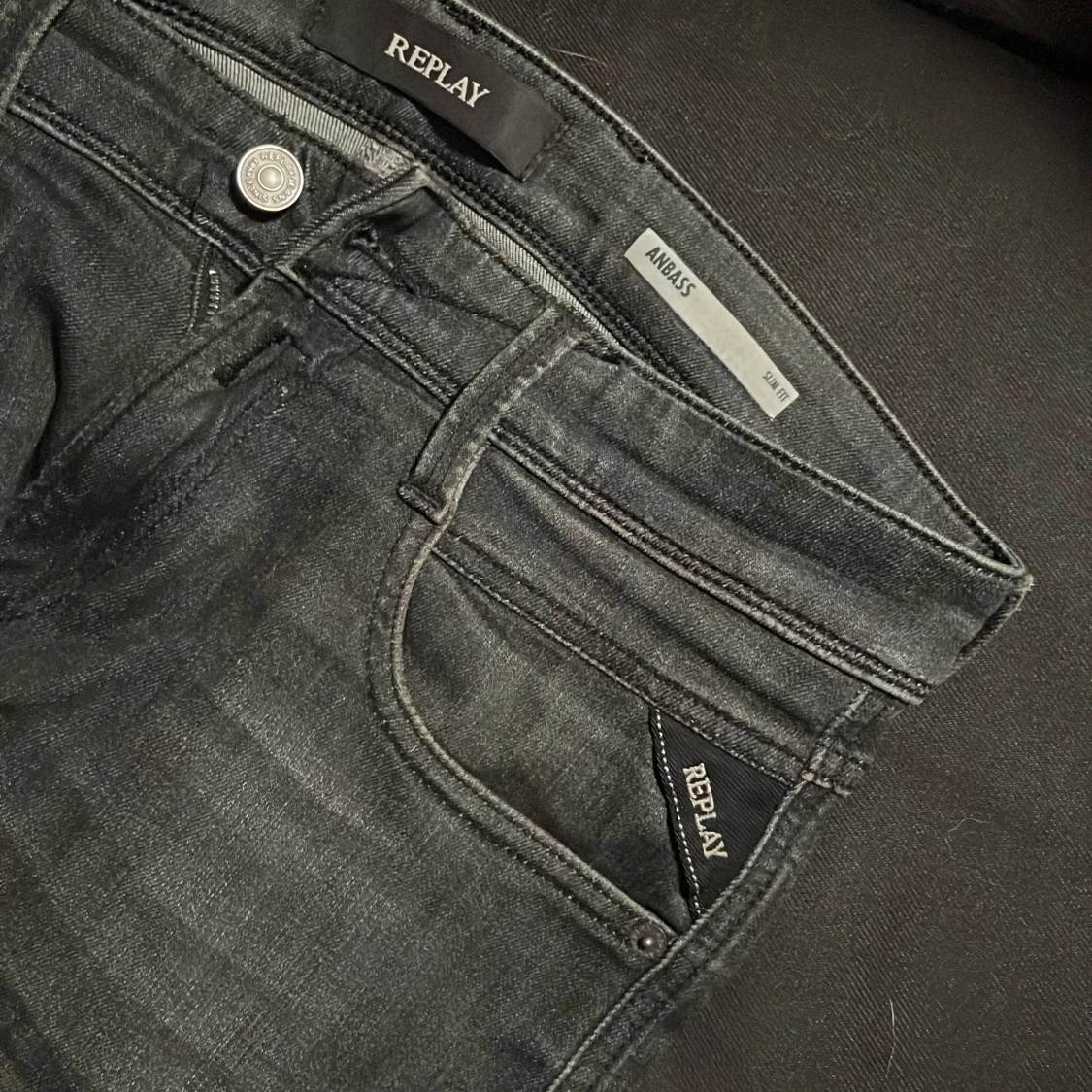 Säljer ett par mörkgråa Anbass Replay jeans med klassisk femficksdesign och snygga detaljer på bakfickorna. Jeansen har raka ben och normal passform, med Replay-logga på bakfickan och patch vid midjan.