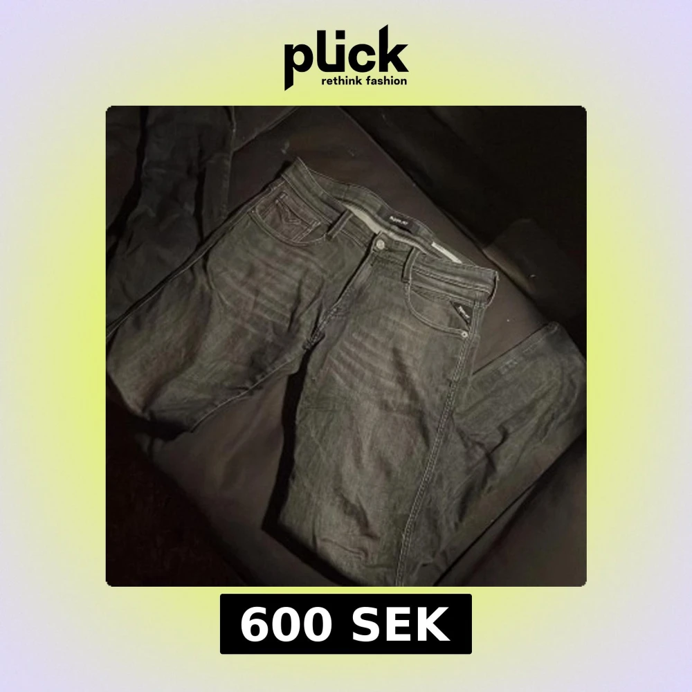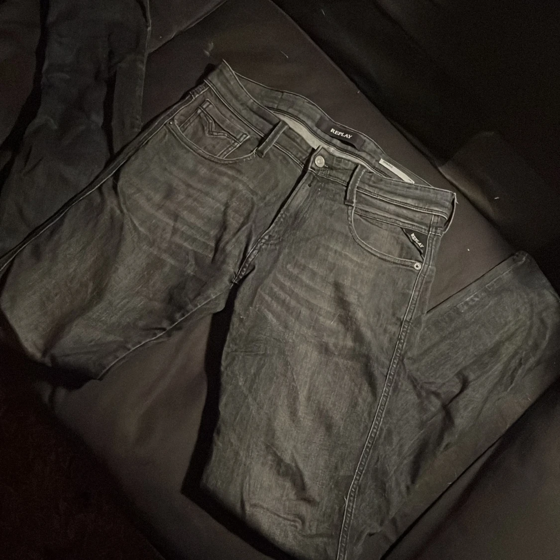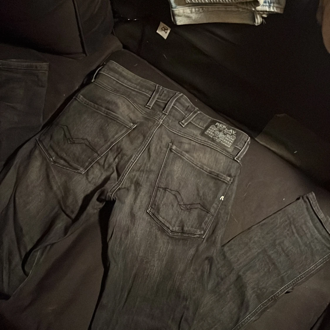 Säljer ett par mörkgråa Anbass Replay jeans med klassisk femficksdesign och snygga detaljer på bakfickorna. Jeansen har raka ben och normal passform, med Replay-logga på bakfickan och patch vid midjan.