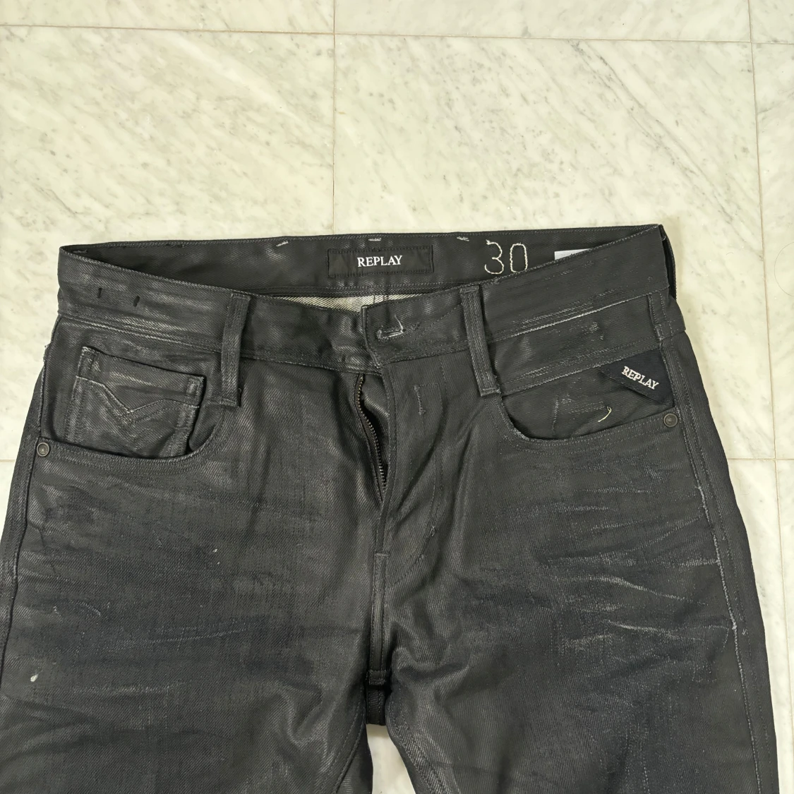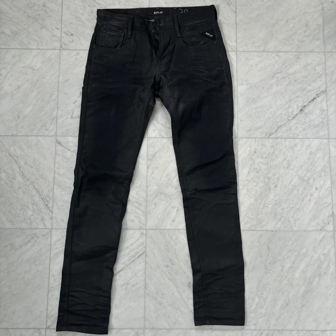 Svarta jeans från Replay med slim fit och klassisk femficksdesign. Byxorna har dragkedja, bälteshällor och Replay-logga på fickan. Materialet är jeans med en lätt glansig finish som ger en cool vibe. Passar dig som gillar stilrena och moderna jeans.
