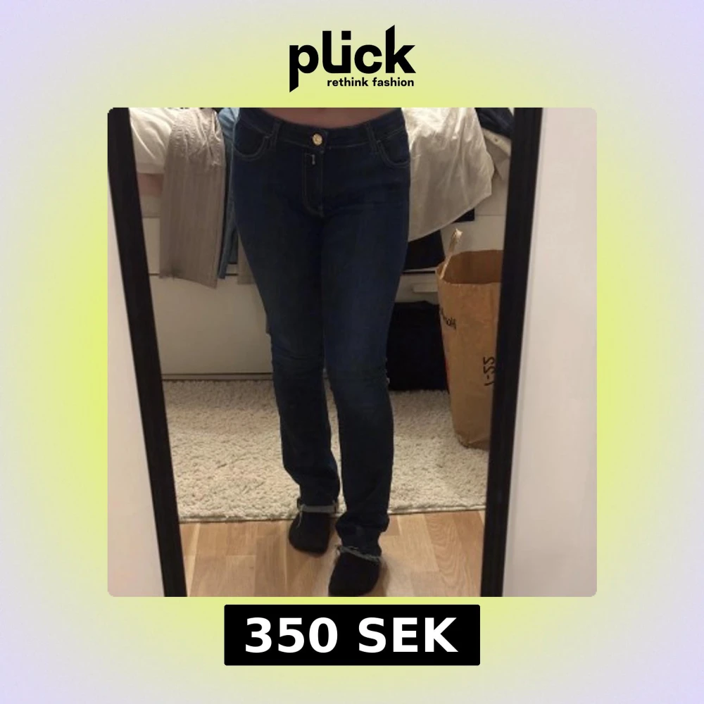 Säljer ett par straight/utsvängda mörkblå jeans från Replay. De är tighta och har en låg/mellan midja med klassisk femficksdesign. Perfekta för en stilren look.