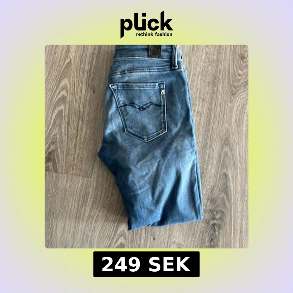 Säljer ett par Replay Anbass jeans i klassisk blå tvätt med snygga slitningar. Jeansen har skinny fit, fem fickor och detaljerad bakficka med broderad våg. Metallknapp och dragkedja framtill. Perfekta för dig som gillar en tajt passform och stilren look. Kan gå ner i pris