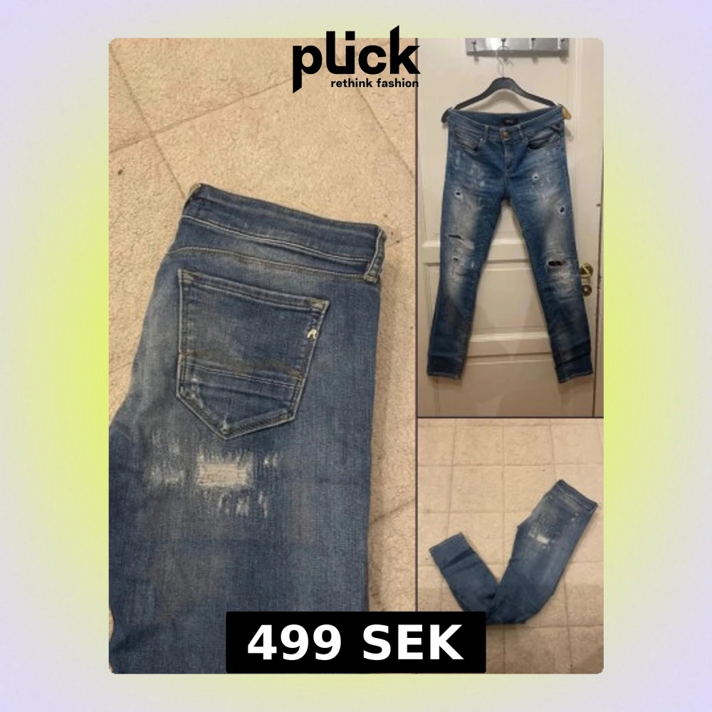 Säljer ett par blå jeans från Replay med slitningar och hål på framsidan. Jeansen har klassisk femficksdesign, knapp och dragkedja i gylfen samt smal passform. Perfekta för dig som gillar en tuff och avslappnad stil.