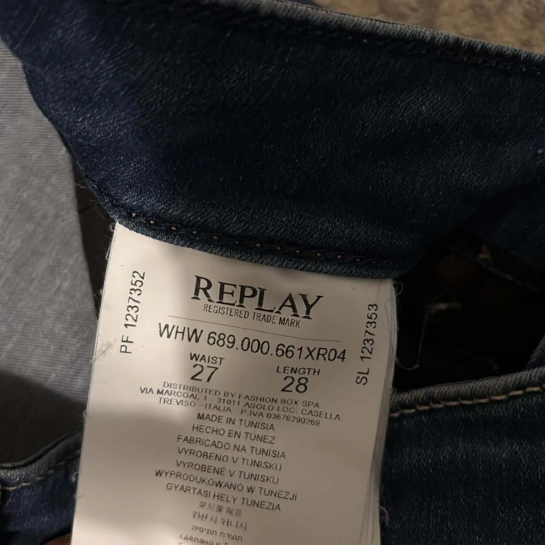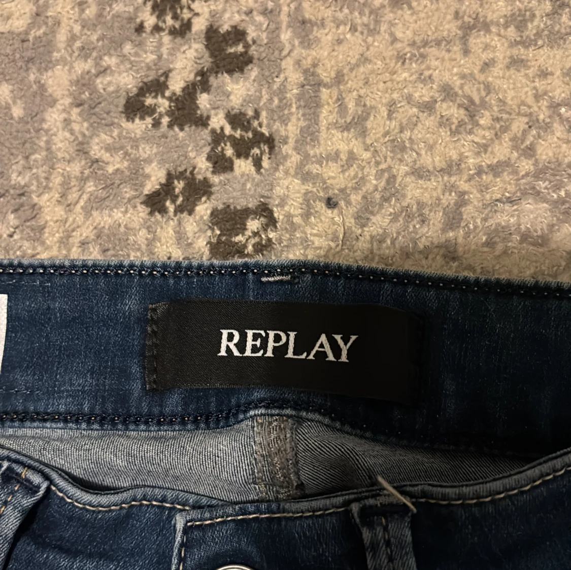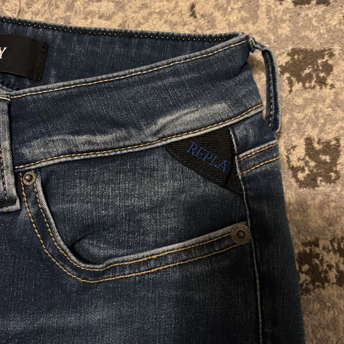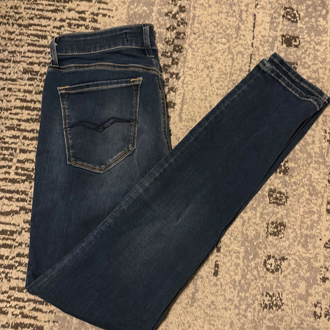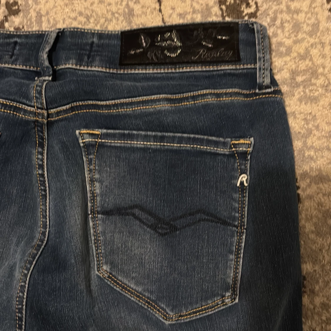 Säljer ett par snygga Replay jeans i mörkblå tvätt med klassiska kontrastsömmar och diskret Replay-logga vid fickan. Modellen har smal passform och raka ben, perfekt till sneakers eller boots. Materialet är mjukt och stretchigt jeans för extra komfort.