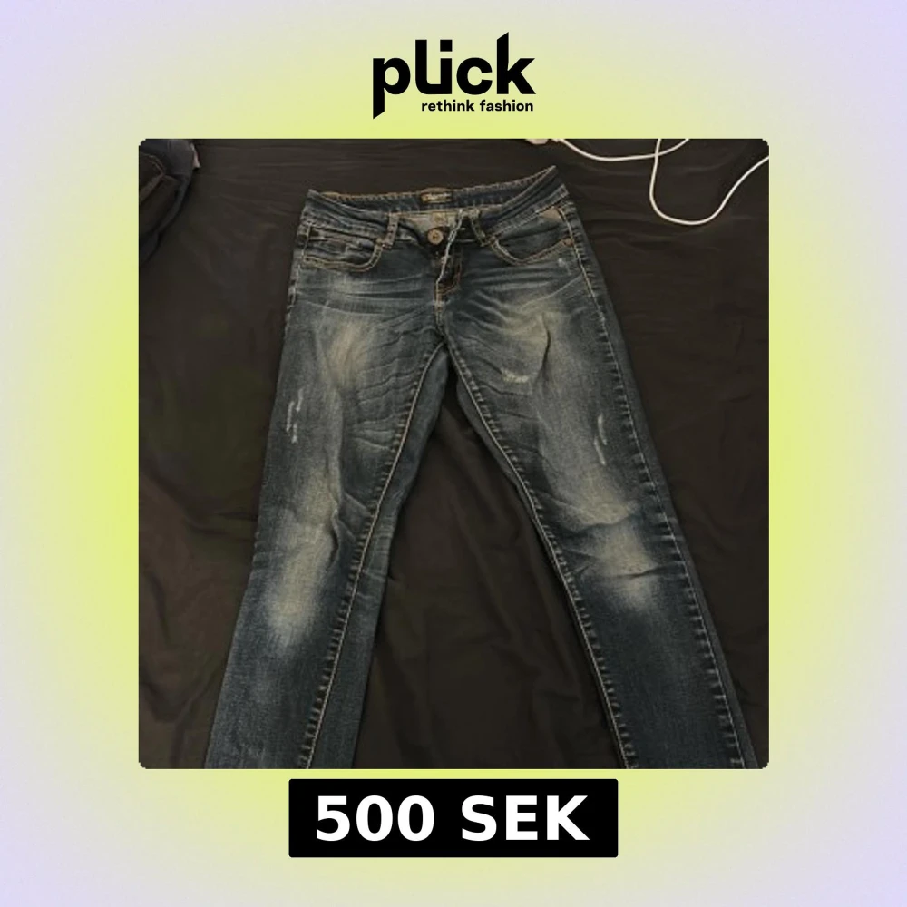Säljer ett par blå jeansbyxor från Replay med snygga slitningar och klassisk femficksdesign. Byxorna har kontrastsömmar och normal passform. Perfekta för dig som gillar en tidlös jeanslook.