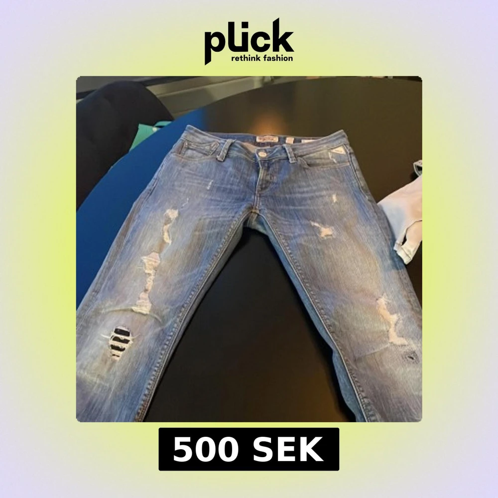 Snygga blå jeans från Replay med slitna detaljer och broderad logga på baksidan, storlek är W27 L32