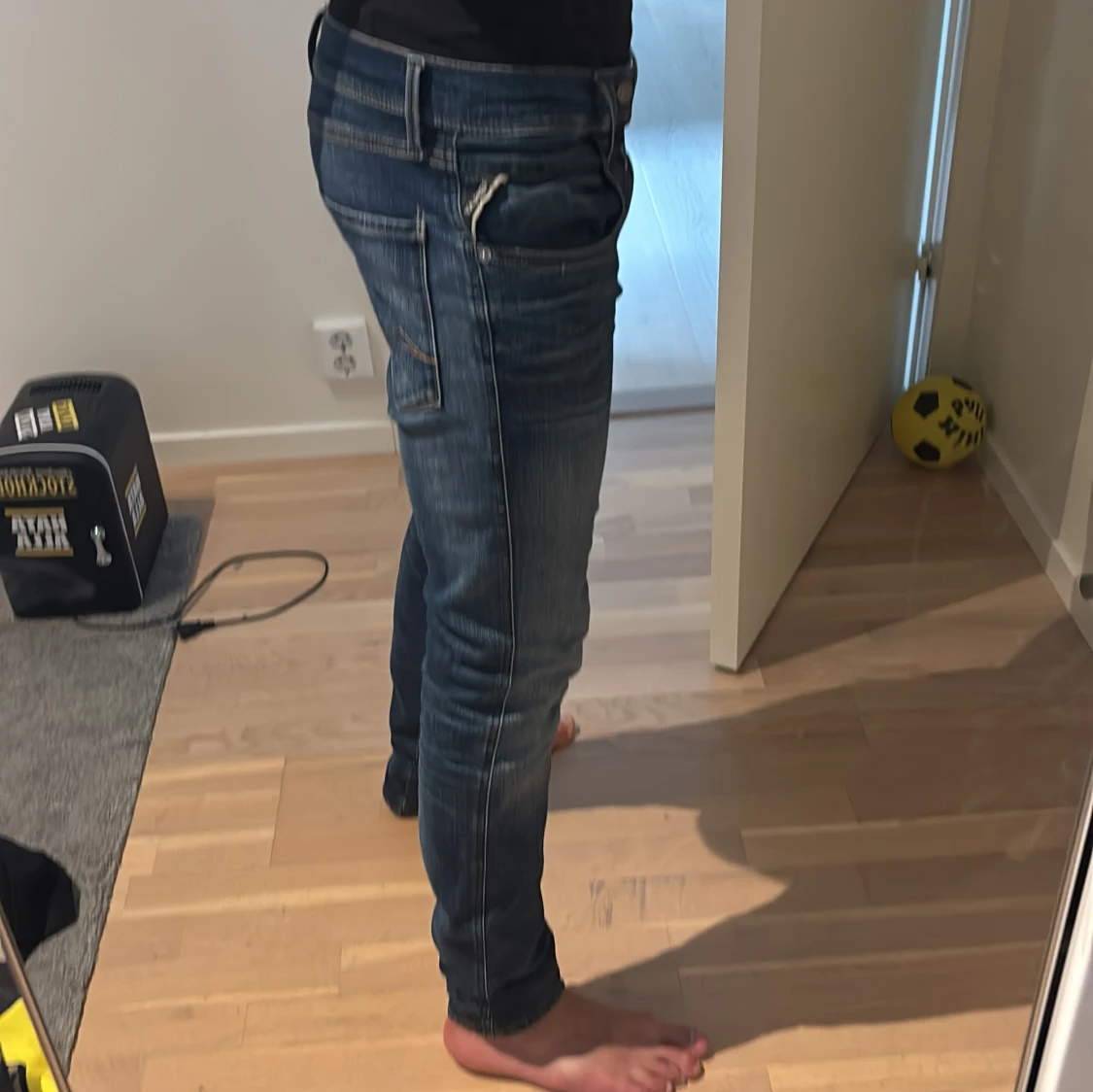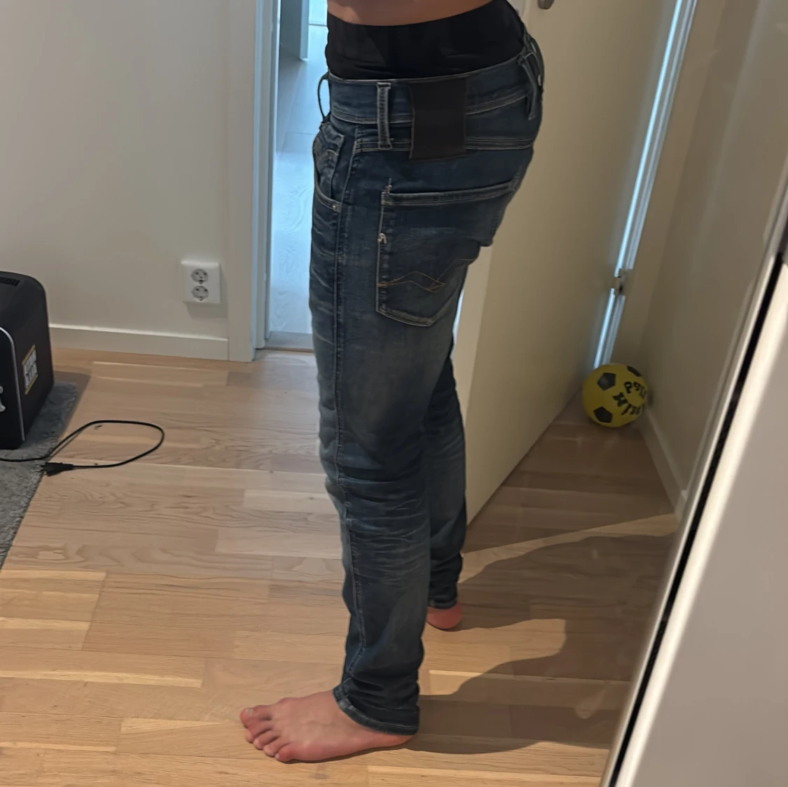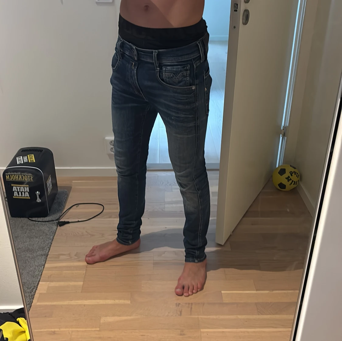 Säljer ett par blå replay ambass hyperflex jeans med snygga slitningar och tvättade detaljer. Jeansen har klassisk femficksdesign, dragkedja och smal passform hela vägen ner. Perfekta för dig som gillar en tajt look och vill ha ett par jeans som sitter riktigt bra. Inga hål och väldigt bra skick. Priset är inte hugget i stenen. Skriv vid frågor eller funderingar. Storlek 28/32. Ny pris 1800kr
