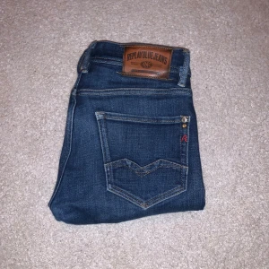 Snygga mörkblå jeans från Replay med klassisk femficksdesign och läderpatch på baksidan. Jeansen har en slimfit passform och är perfekta för en stilren look. De är tillverkade i ett slitstarkt denimtyg. Storlek 28 W, 32 L