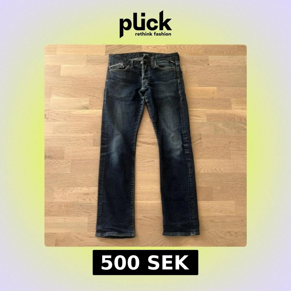 Snygga mörkblå jeans från Replay med klassisk femficksdesign och diskreta slitningar. Jeansen har raka ben och slim passform, med detaljerade sömmar och logga på bakfickan. Storleken är 28/32 men skulle snarare säga att de passar 27/30. Byxorna är bra för dig som är runt 165cm. Priset är ej hugget i sten.