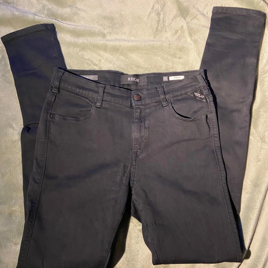 Säljer ett par svarta Replay Hyperflex jeans i modellen Stella. Jeansen har klassisk femficksdesign, stretchigt material och normal passform. Perfekta om du vill ha ett par stilrena och bekväma jeans med snygg look. Passar till allt och är riktigt sköna på.