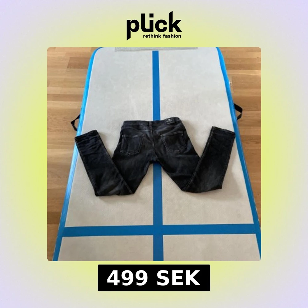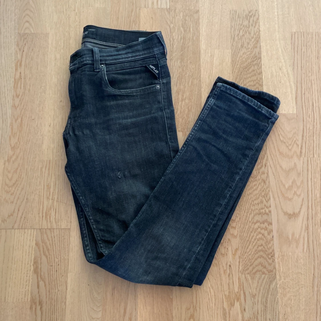 Säljer ett par svarta Replay jeans med diskret tvättad look och klassiska fem fickor. Jeansen har smal passform och normal midja, med snygga detaljer vid fickorna och logotyp på etiketten. Perfekta för dig som gillar stilrena och bekväma jeans.
