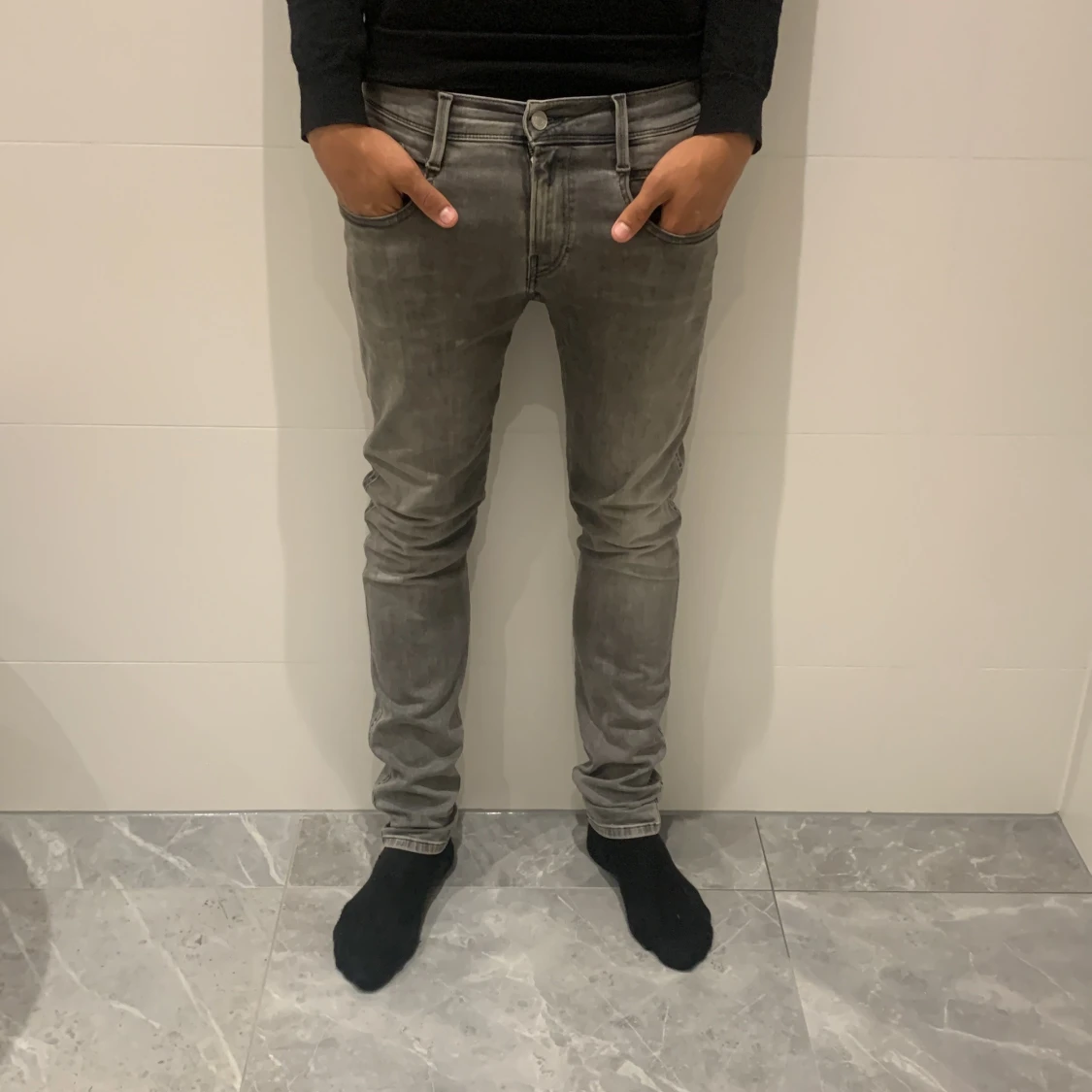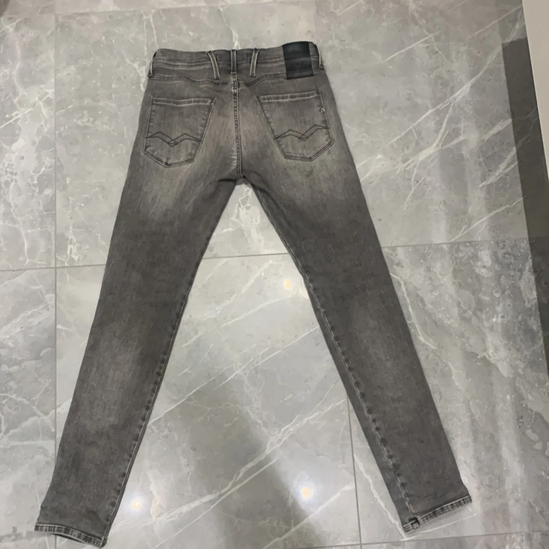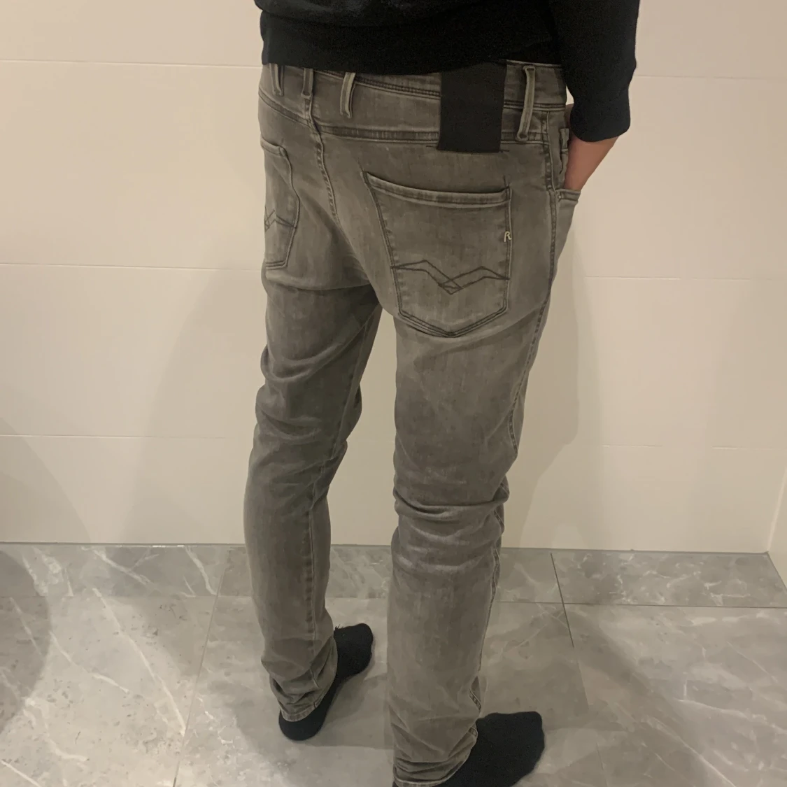Snygga Replay Hyperflex jeans i grå tvätt med klassisk femficksdesign och svarta detaljer på bakfickan. Jeansen har slim fit. Storleken är W29 L32.