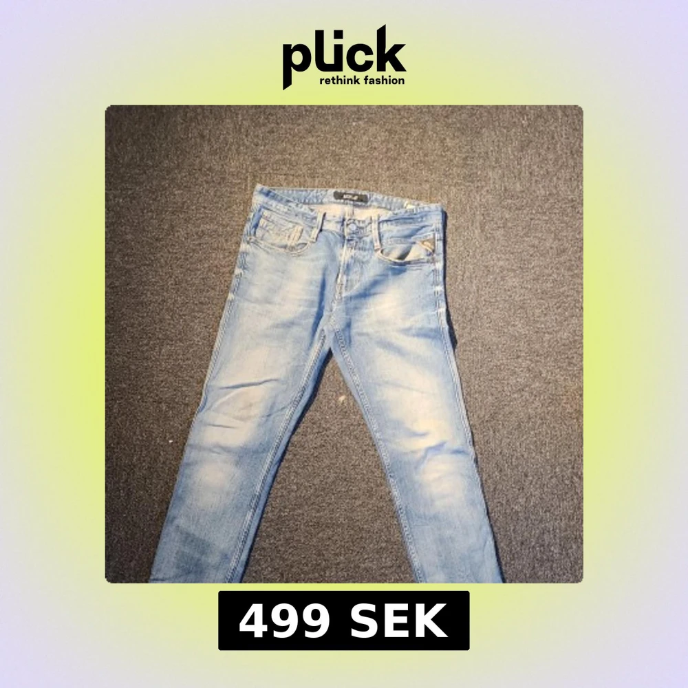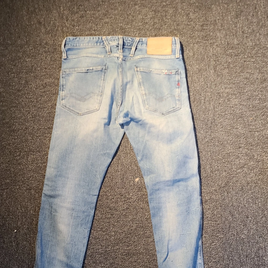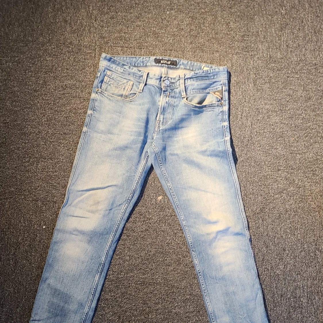 Säljer ett par ljusblå jeans från Replay med snyggt slitna detaljer och klassisk femficksdesign. Jeansen har smal passform och är tillverkade i mjukt denimtyg med dragkedjegylf. Perfekta för en avslappnad och trendig look.