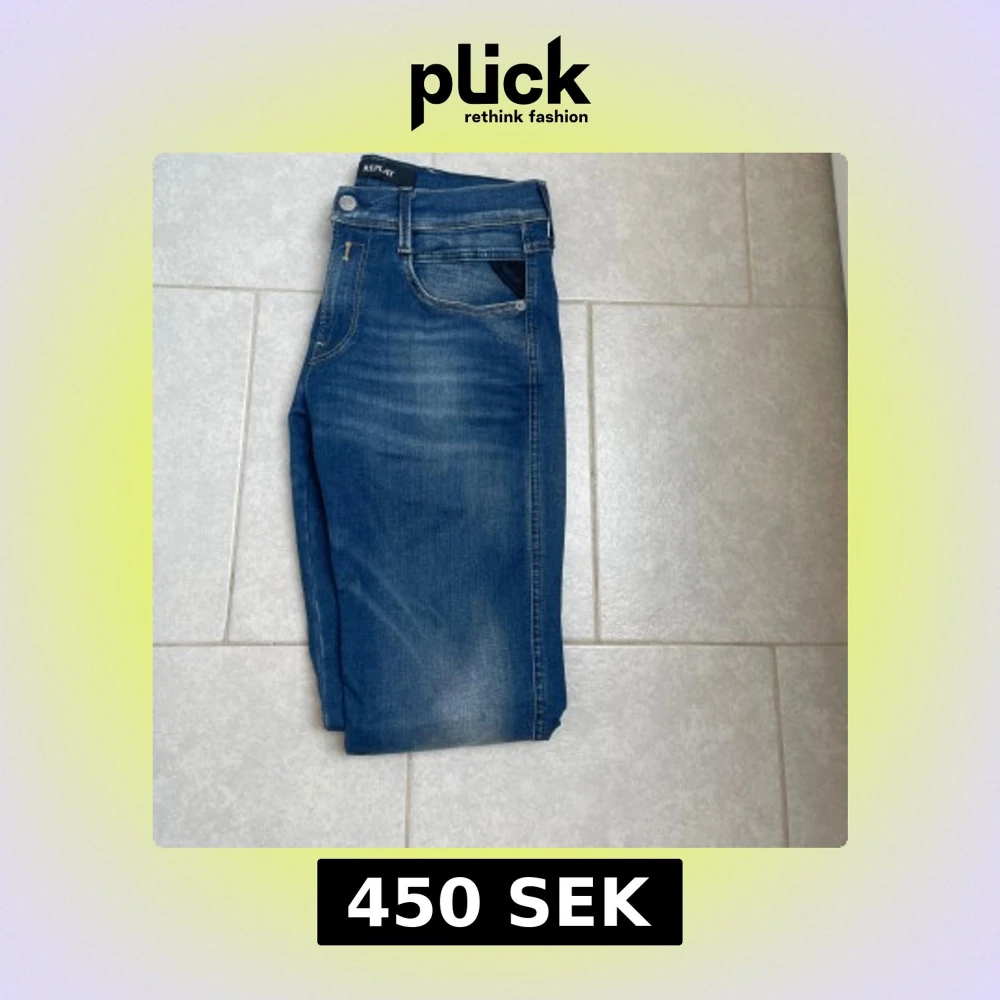 Säljer ett par klassiska blå Replay Anbass jeans med fem fickor och snygga slitningar. De är iprincip helt oanvända, strl 29/30