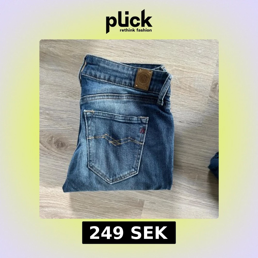 Säljer ett par blå jeans från Replay med klassisk femficksdesign och snygga slitningar. Jeansen har kontrastsömmar och en läderpatch bak i midjan. Perfekta för dig som gillar en avslappnad men stilren look.