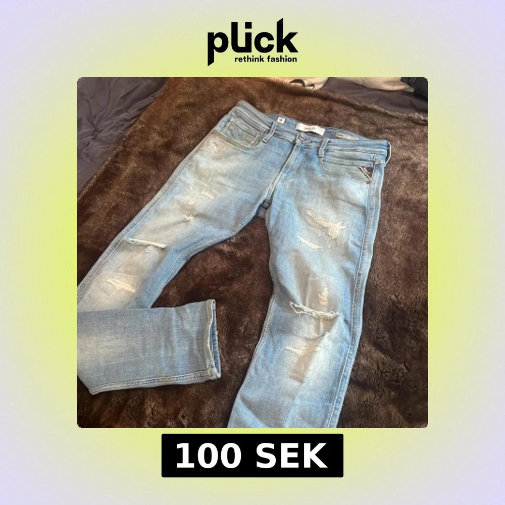 Säljer ett par Replay Anbass jeans (STORLEK W29 L32) ljusblå tvätt med snygga slitningar och distressed detaljer på benen. Modellen har fem fickor, normal passform och klassisk knappgylf. Jeansen är gjorda i mjukt bomullsdenim och har Replay-läderpatch bak i midjan. Hål där bak på jeansen där av pris.