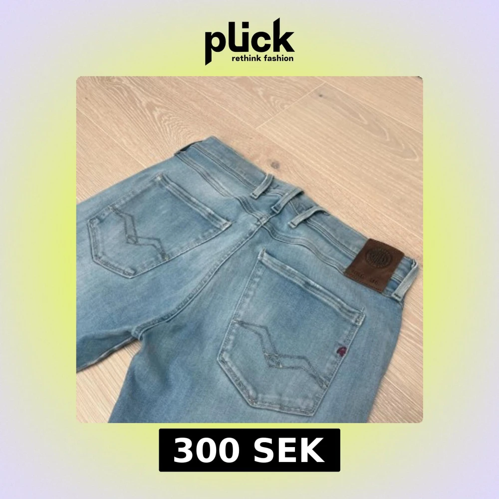 Snygga ljusblå jeans från Replay i model anbass med klassisk femficksdesign och bruna läderpatch bak. Jeansen har skinny passform, raka ben och subtila slitningar framtill. Materialet är mjukt jeans med stretch för extra komfort. Storlek 29/32, hör gärna av er vid funderingar.