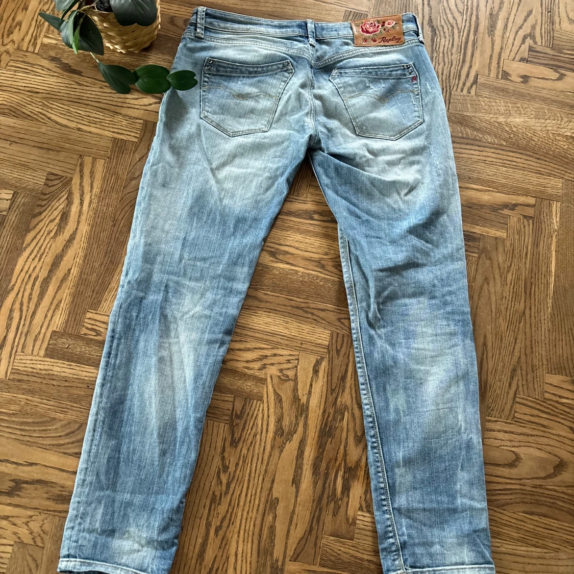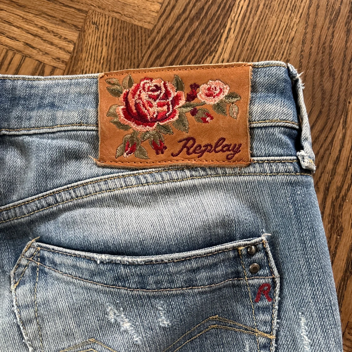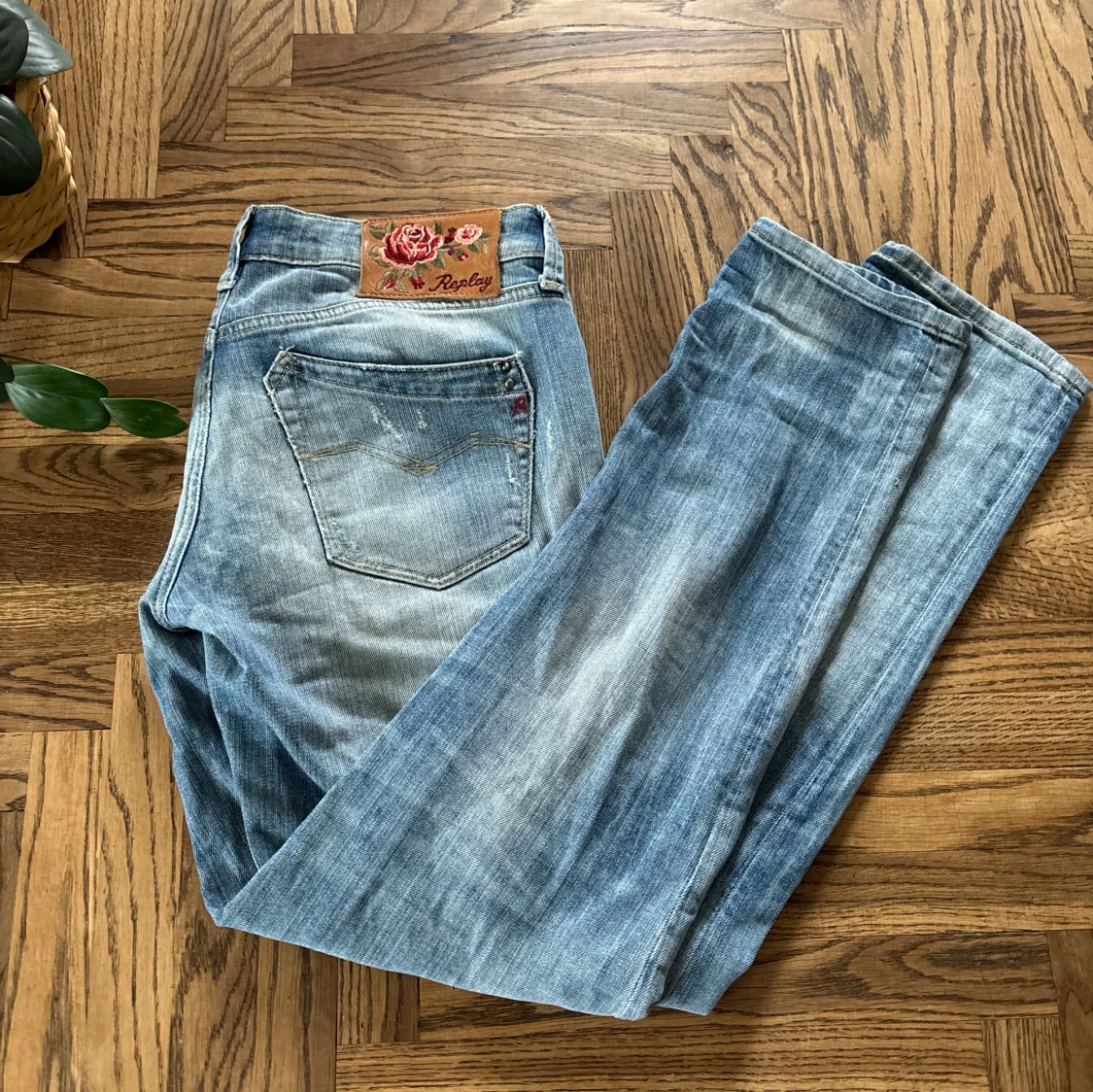 Säljer ett par ljusblå jeans från Replay med snyggt slitna detaljer och broderad patch med rosor på bakfickan. Jeansen har raka ben, klassisk femficksmodell och är tillverkade i mjukt denimtyg. Perfekta för en avslappnad och trendig look.