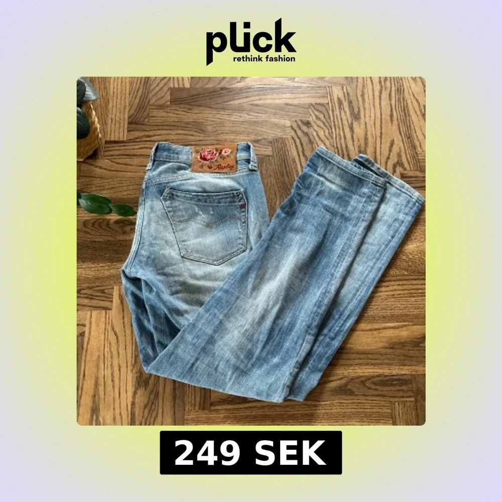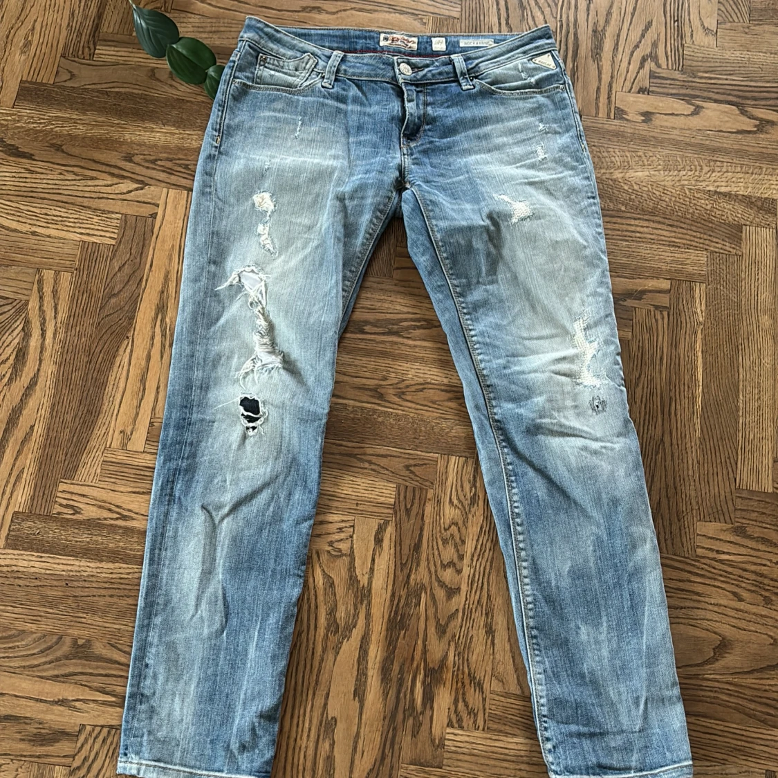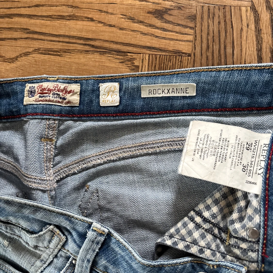 Säljer ett par ljusblå jeans från Replay med snyggt slitna detaljer och broderad patch med rosor på bakfickan. Jeansen har raka ben, klassisk femficksmodell och är tillverkade i mjukt denimtyg. Perfekta för en avslappnad och trendig look.