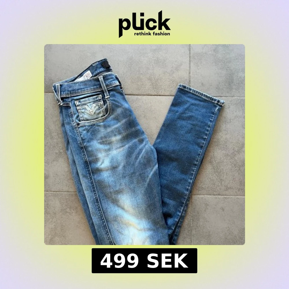 Säljer ett par Replay Anbass jeans i klassisk blå tvätt med snygga slitningar och kontrastsömmar. Modellen har raka ben och fem fickor, samt Replay-logga på bakfickan. Perfekta för dig som gillar en tidlös jeanslook.