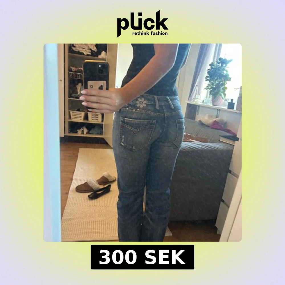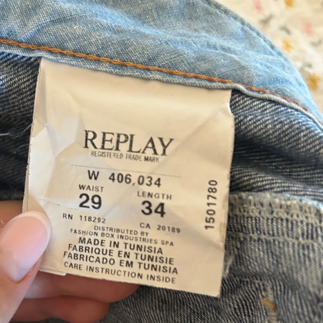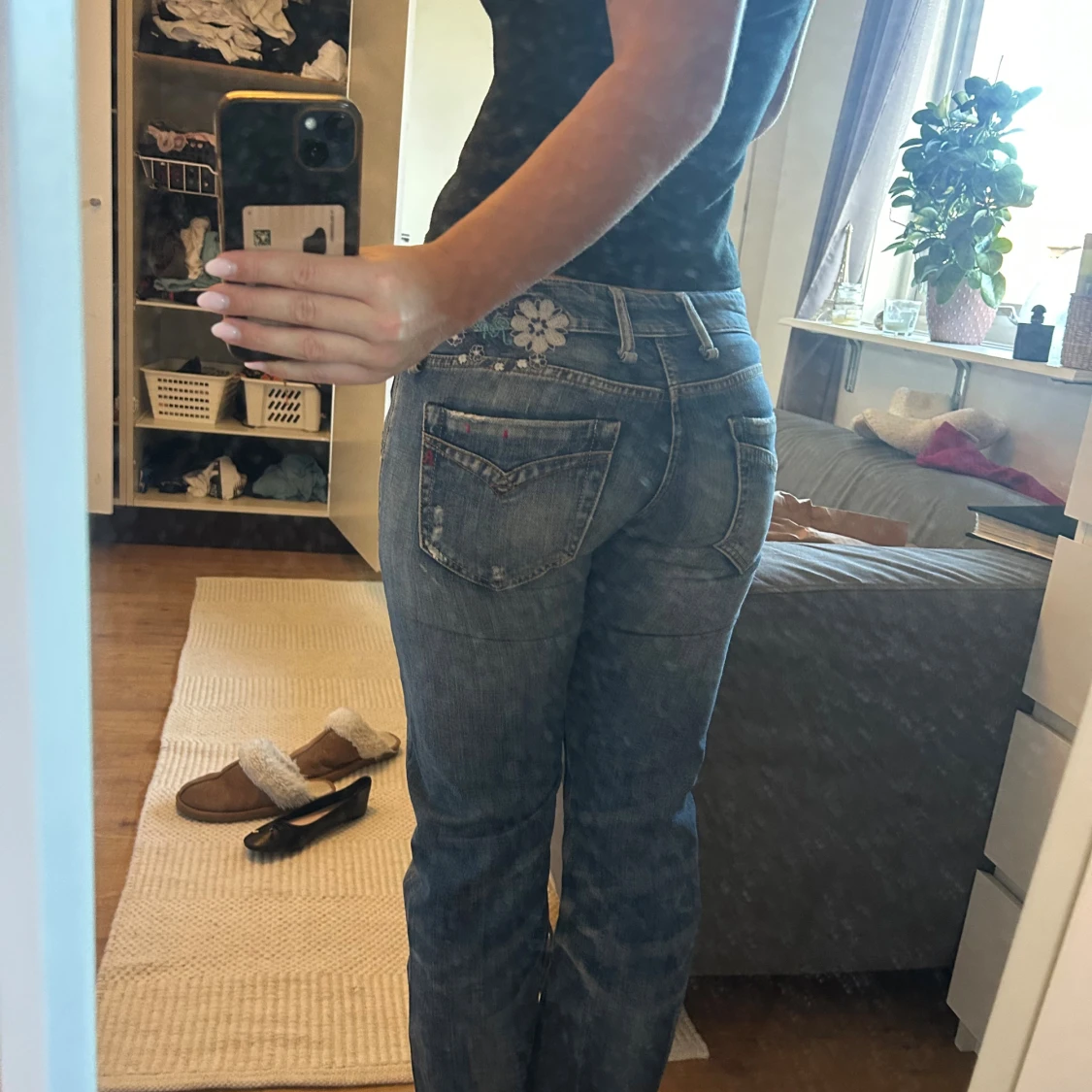 Säljer ett par blå Replay jeans med snyggt slitna detaljer och broderad blomma vid bakfickan.