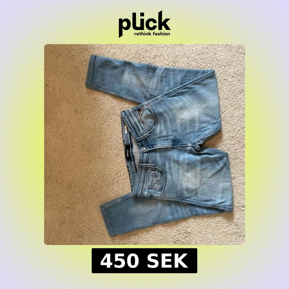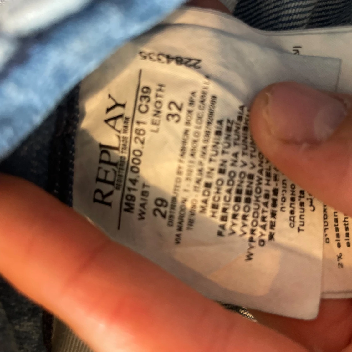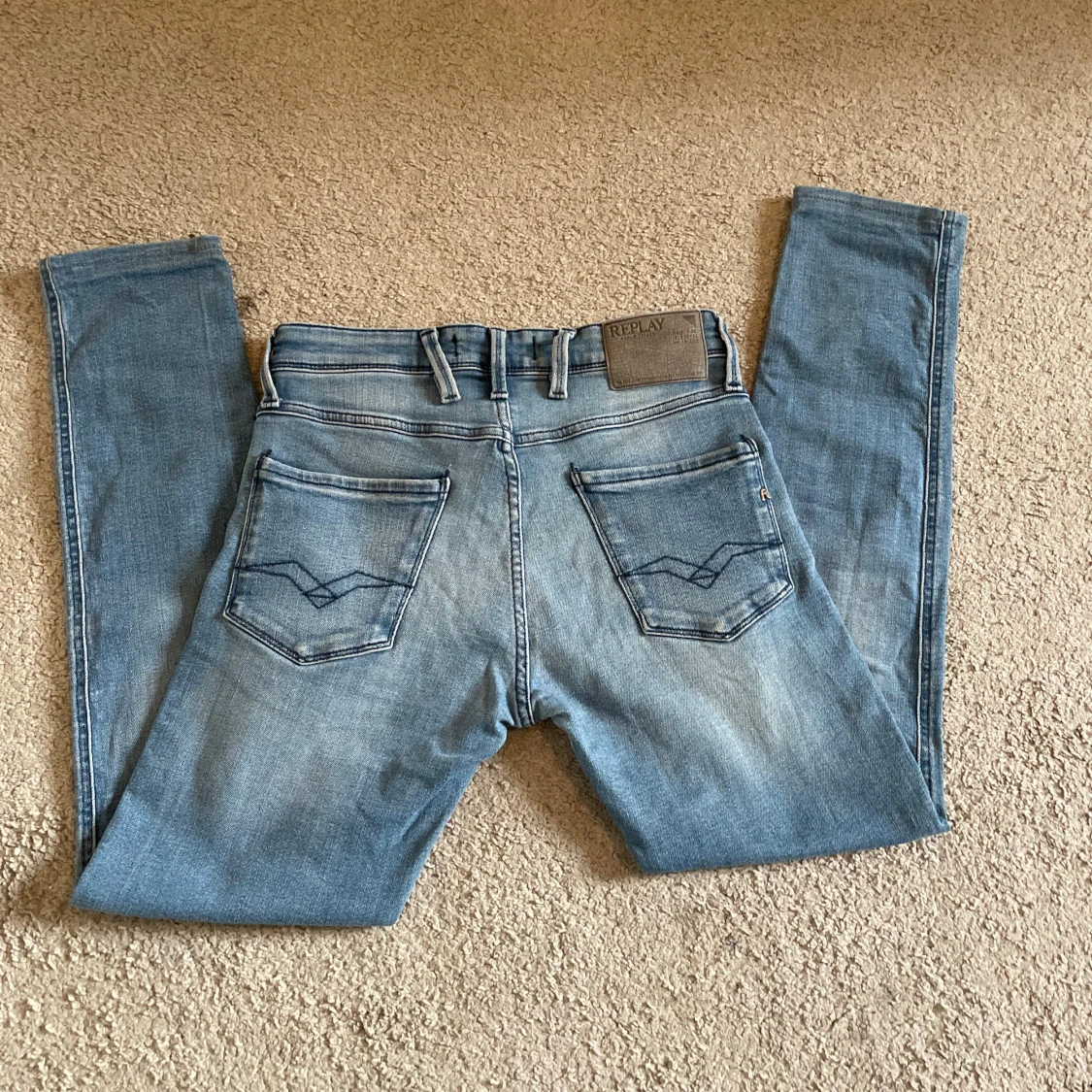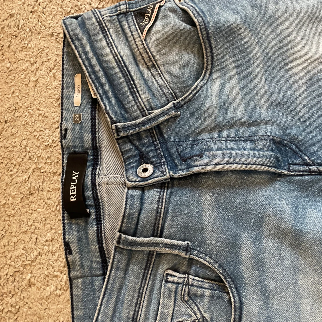 Säljer ett par Replay Anbass jeans i ljusblå tvätt med snygga slitningar. Klassisk femficksmodell med Replay-logga på bakfickan och detaljerade sömmar. Jeansen har normal passform och är tillverkade i mjukt denimtyg för en skön känsla. Storlek 29/32