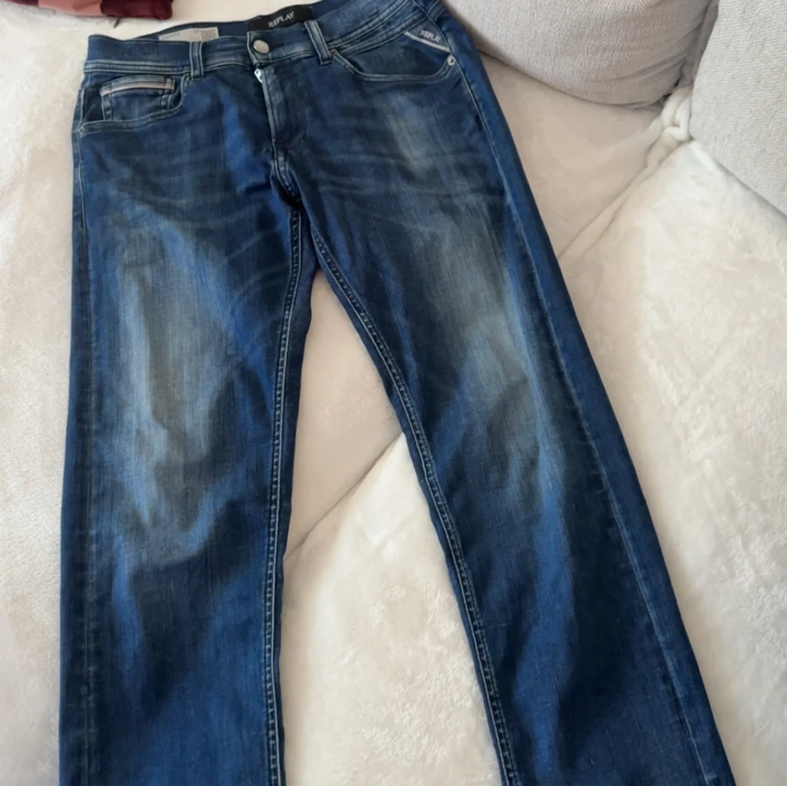 Snygga blå jeans från Replay med klassisk femficksmodell och raka ben. Jeansen har en mörk tvätt med lätt slitning framtill och bakficka med diskret söm. Perfekta för dig som gillar en tidlös och avslappnad stil.
