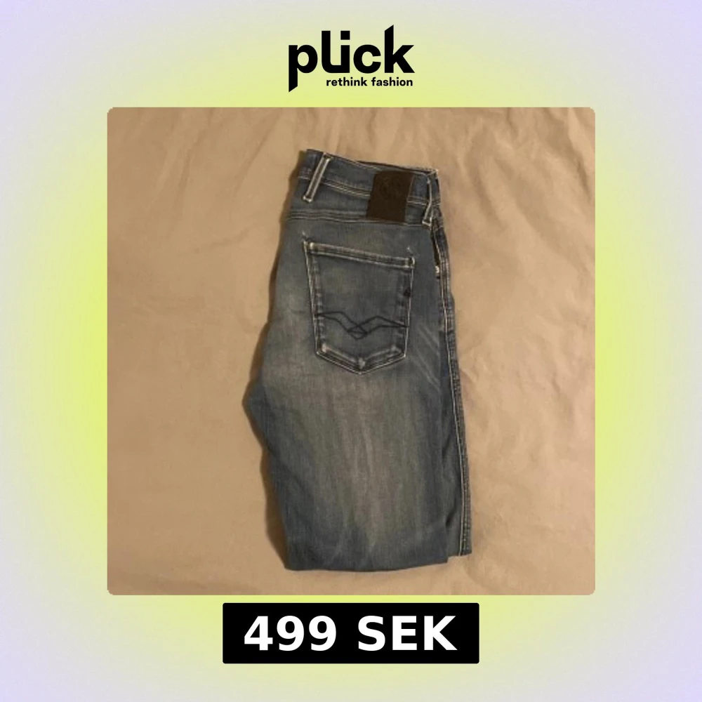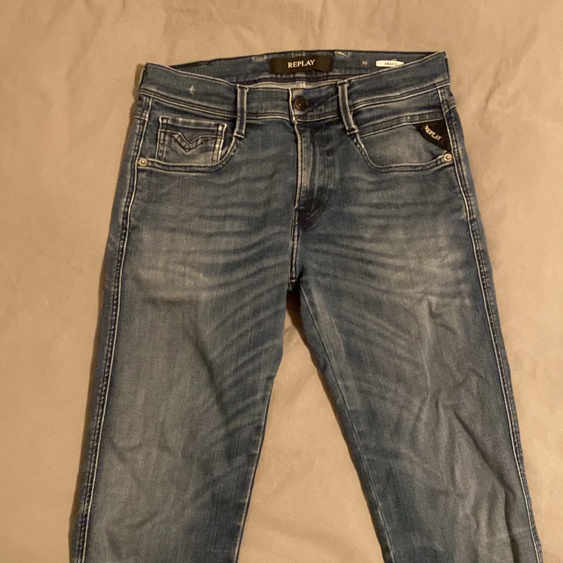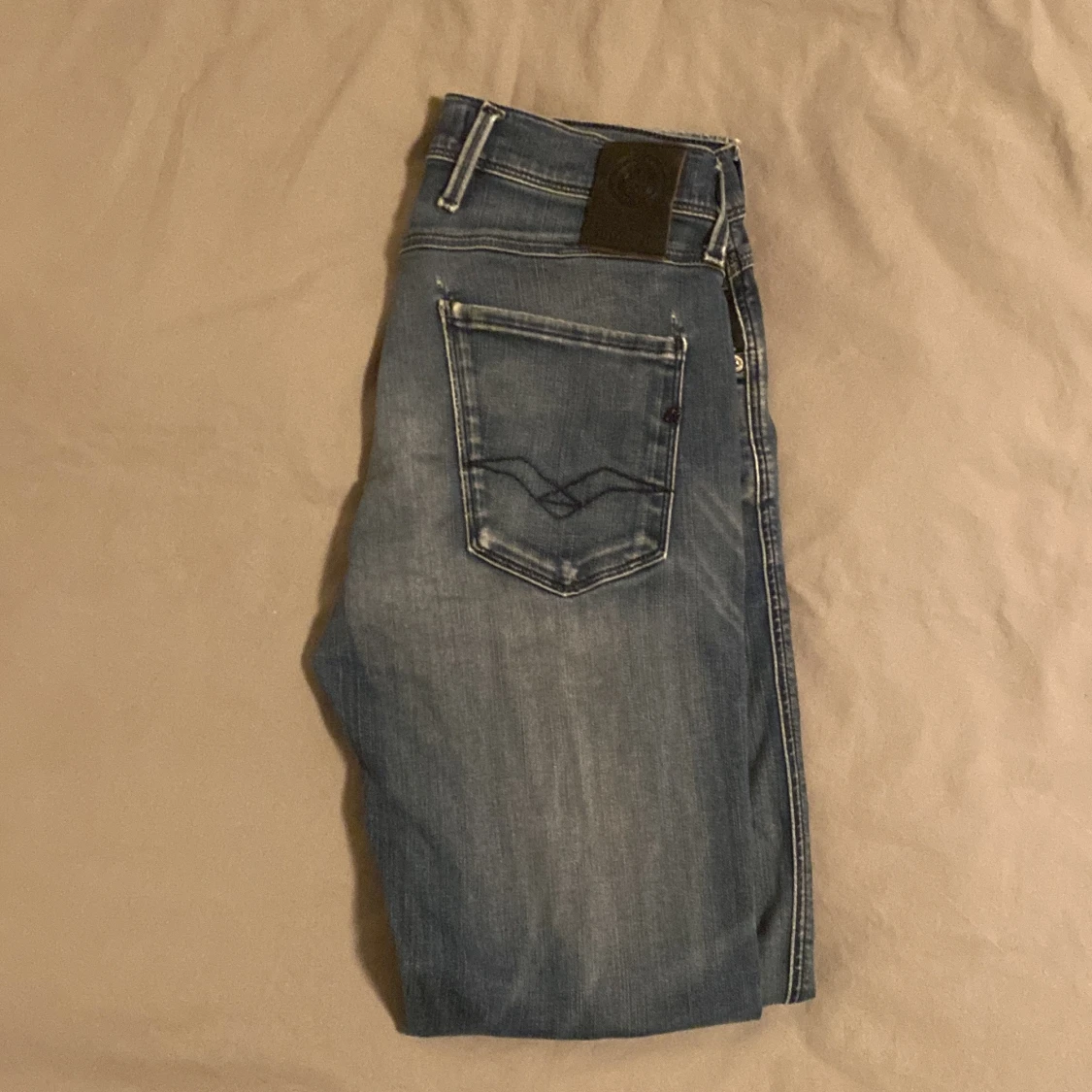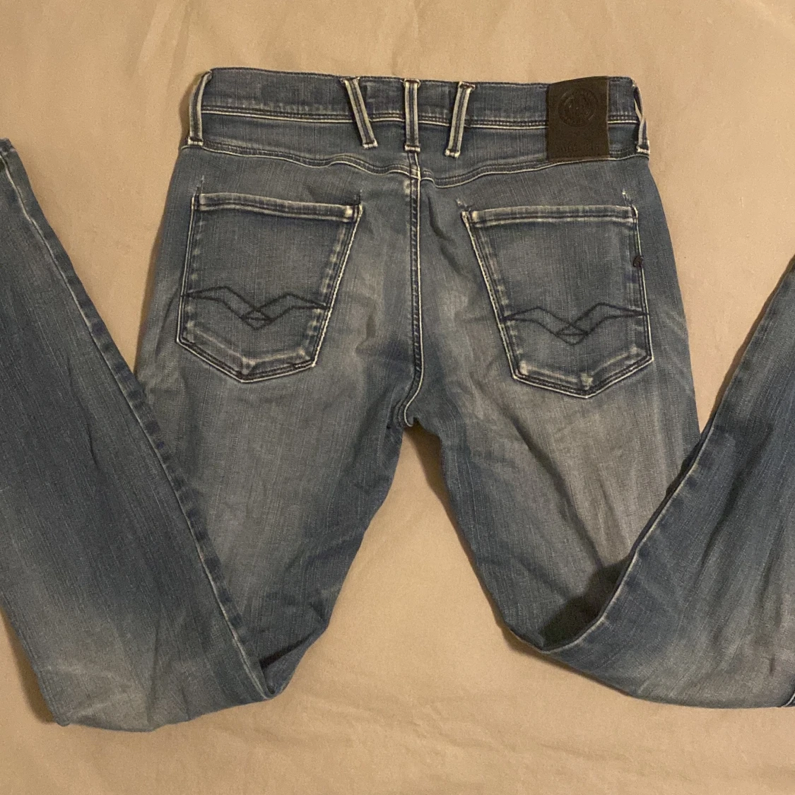 Säljer ett par blå Replay jeans. Jeansen har snygga detaljer på bakfickorna och en bekväm passform. Perfekta för dig som gillar en stilren men ändå avslappnad look.