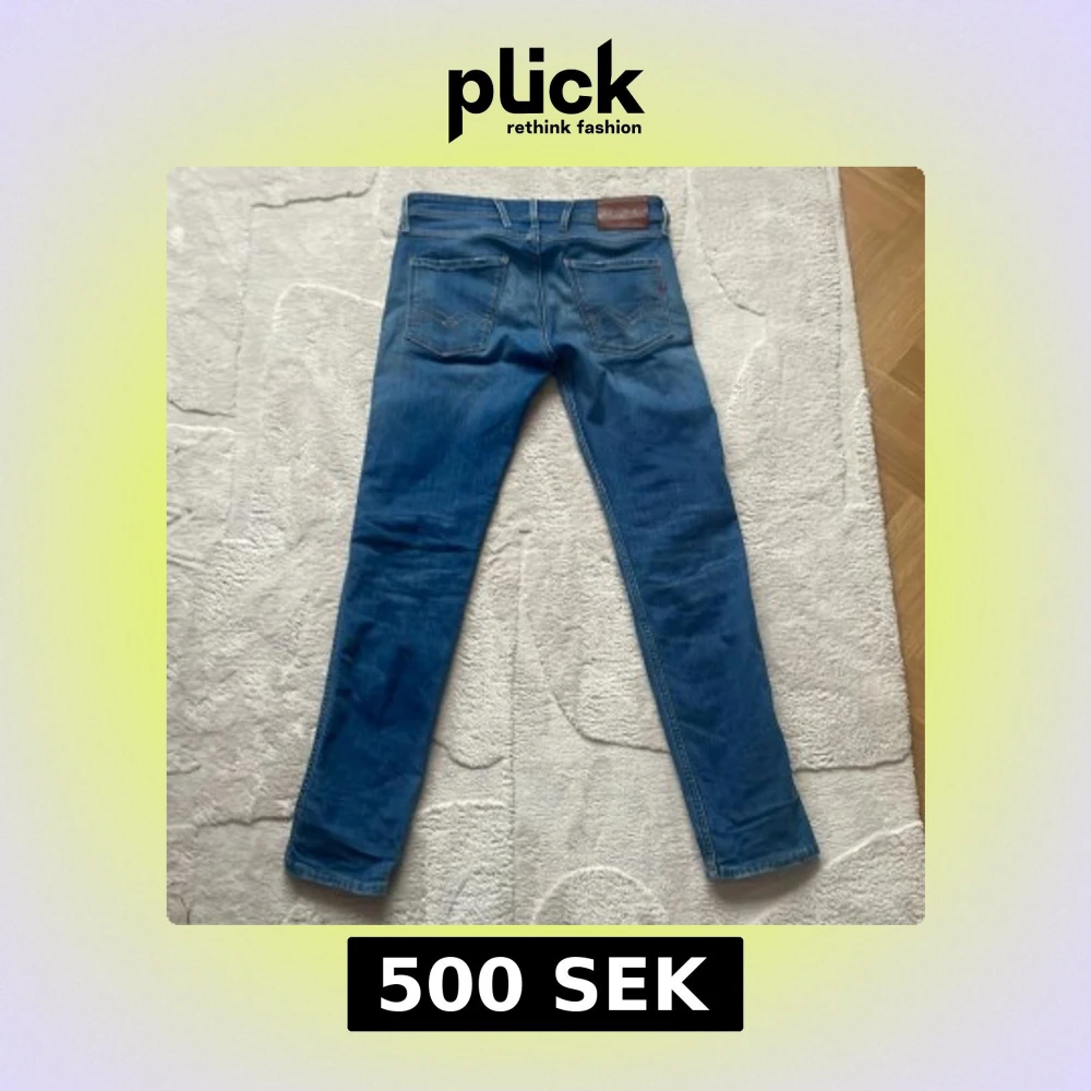 Säljer ett par klassiska blå jeans från Replay med raka ben och fem fickor. Byxorna har snygga slitningar och detaljerade sömmar på bakfickorna. Märkespatch i läder baktill i midjan och Replay-logga på fickan fram.
