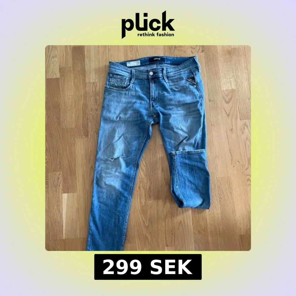 Snygga blå jeans från Replay med klassisk femficksdesign och knappgylf. De har en lätt slitning på framsidan och en läderdetalj vid midjan. Perfekta för en avslappnad stil.