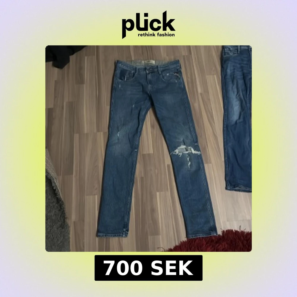 Säljer ett par snygga blå jeans från Replay med slitna detaljer och klassisk femficksdesign. De har en knappgylf och är tillverkade i ett slitstarkt denimtyg. Perfekta för en avslappnad stil.