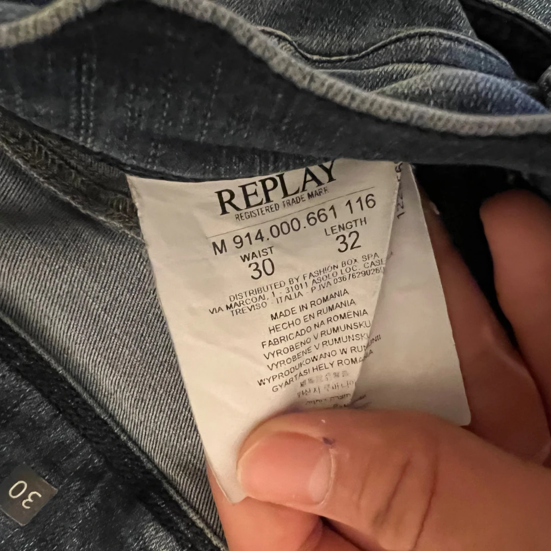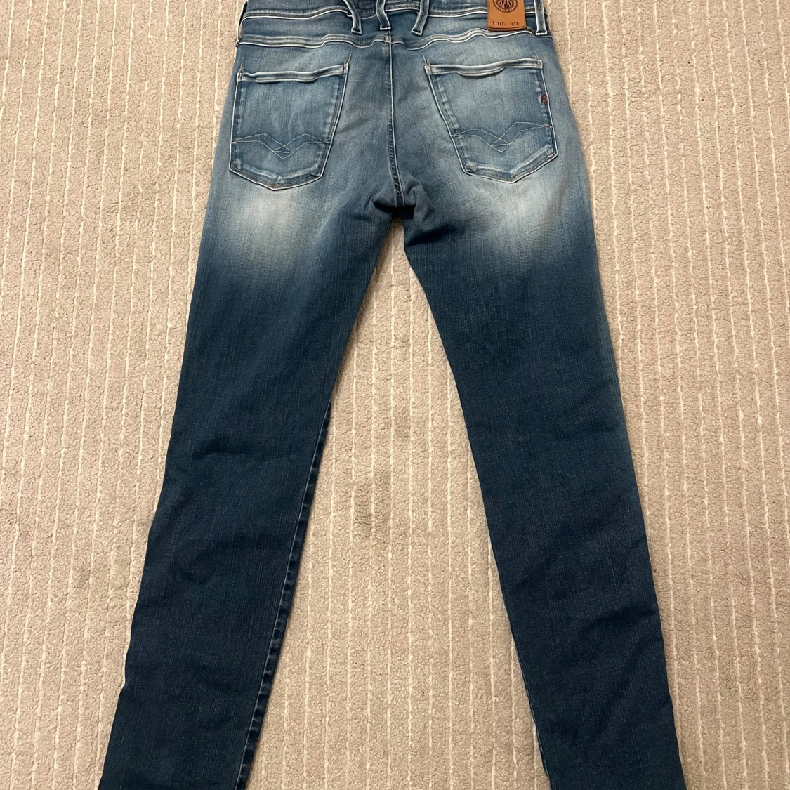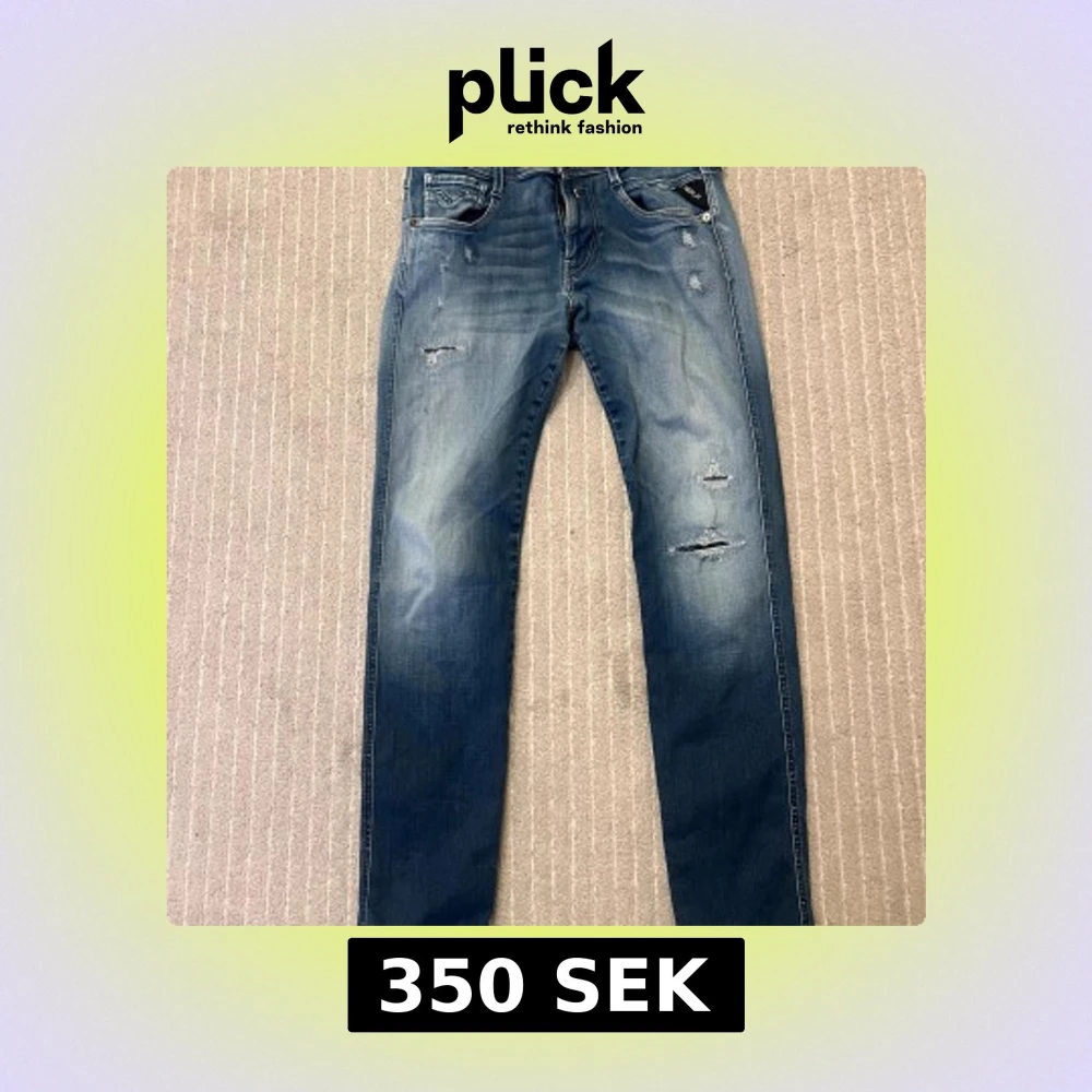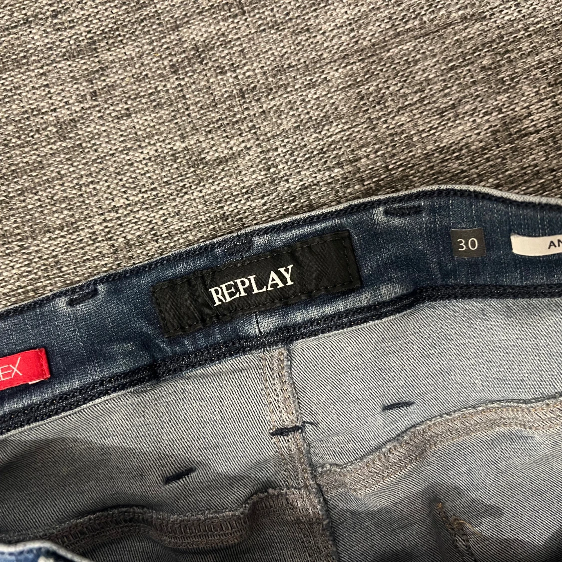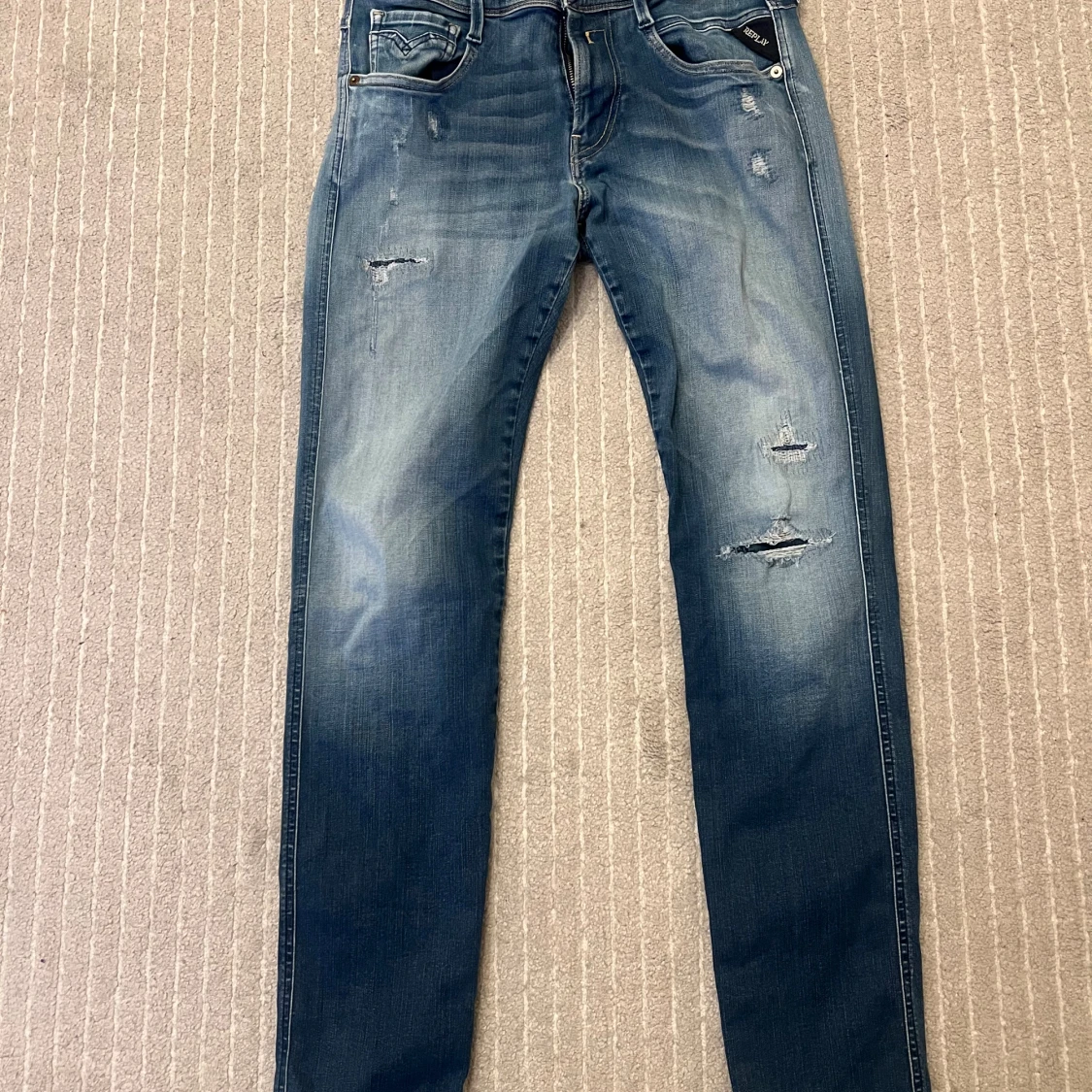 Säljer ett par Replay Anbass jeans i blå tvätt med slitningar och hål på benen. Jeansen har fem fickor, normal passform och är tillverkade i stretchig denim. Snyggt slitna detaljer och klassisk Replay-logga på bakfickan.