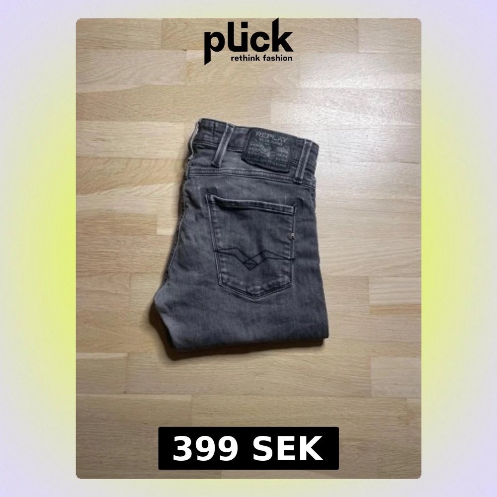 Snygga Replay Anbass jeans i en mörkgrå tvätt med klassisk femficksdesign och tydliga Replay-detaljer på fickor och patch. Jeansen har en slim passform och är tillverkade i mjukt jeanstyg med lite stretch för extra komfort. Den ända defekt som finns är att de är fixade hål som visas på bild 5.