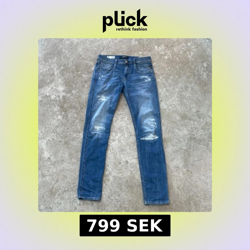 Snygga blå jeansbyxor från Replay, modell Anbass. De har en slim fit passform och är dekorerade med slitningar för en trendig look. Perfekta för en avslappnad stil. Väldigt bra skick och knappast använda, var inte rädda för att ställa frågor 👍