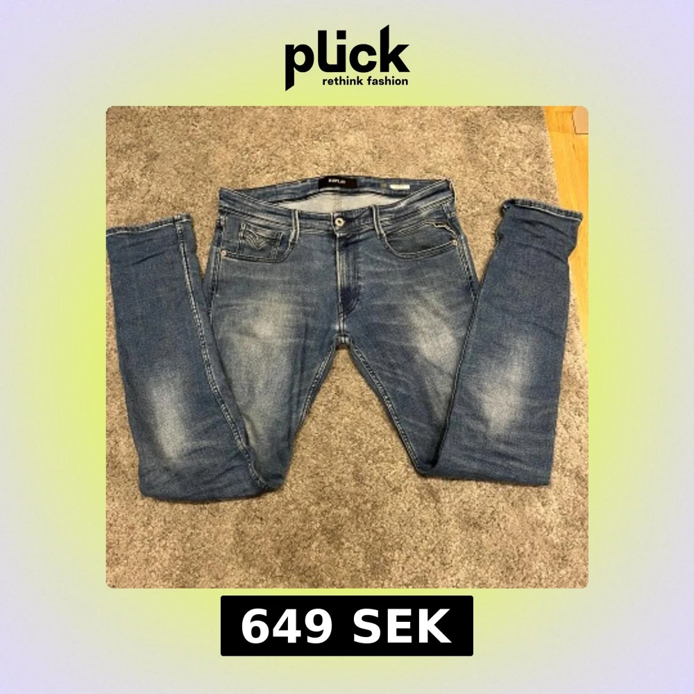 Snygga blå jeans från Replay, modell Anbass. De har en klassisk femficksdesign med subtila slitningar för en trendig look. Perfekta för en avslappnad stil. Byxorna är i mycket bra skick, men har en liten defekt.