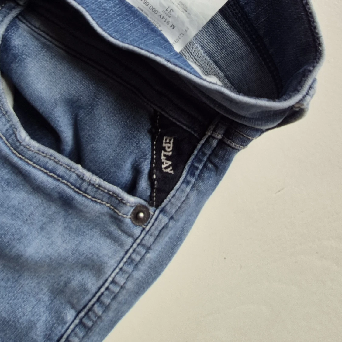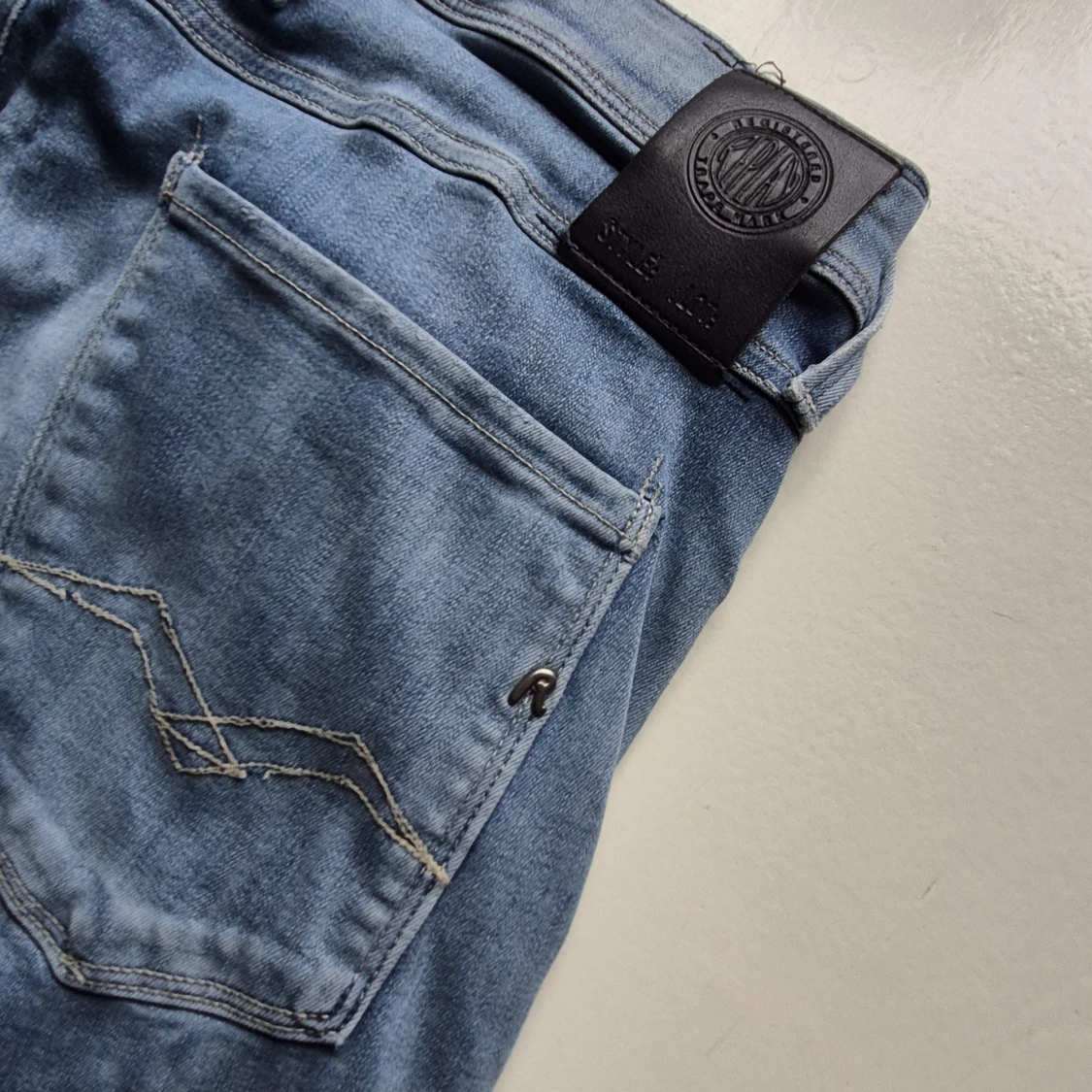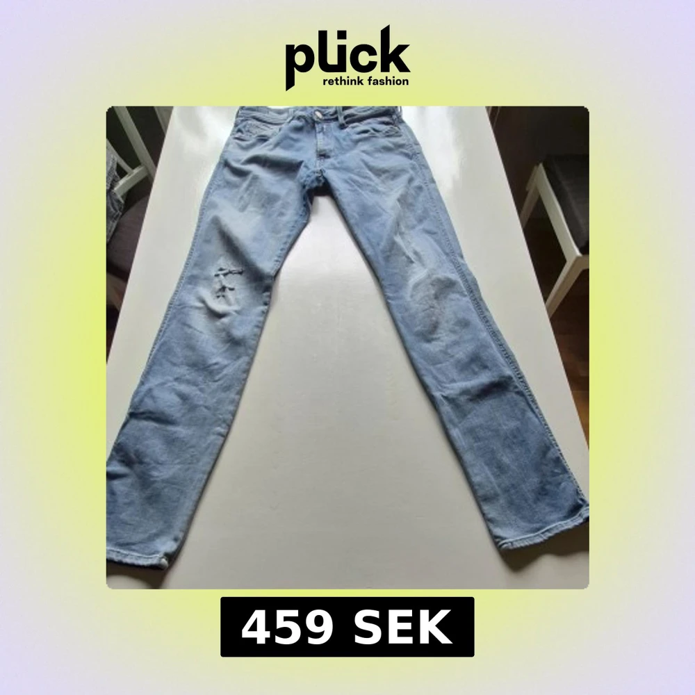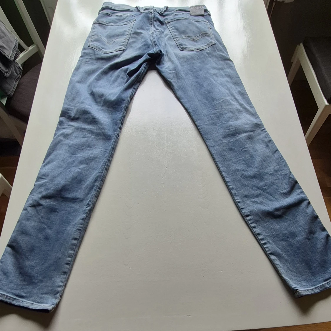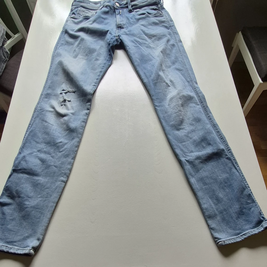Säljer ett par ljusblå jeansbyxor från Replay med klassisk femficksdesign och diskreta slitningar på vänster lår. Byxorna har raka ben och normal passform, samt detaljerad söm på bakfickan. Perfekta för en avslappnad stil.