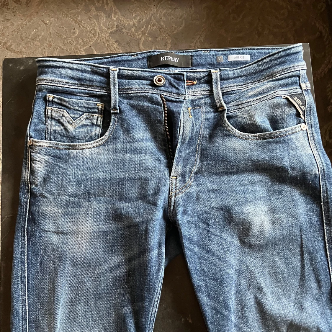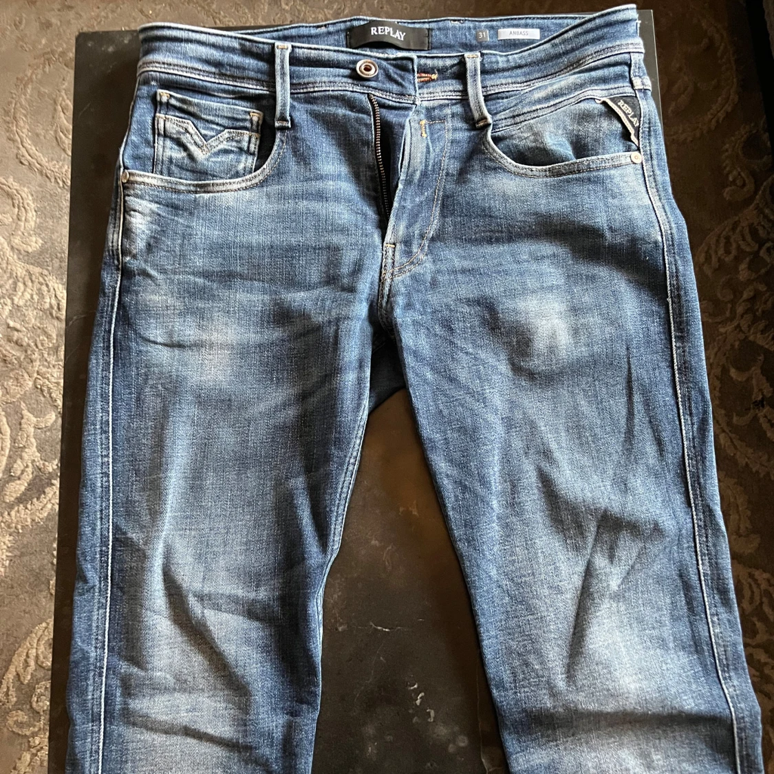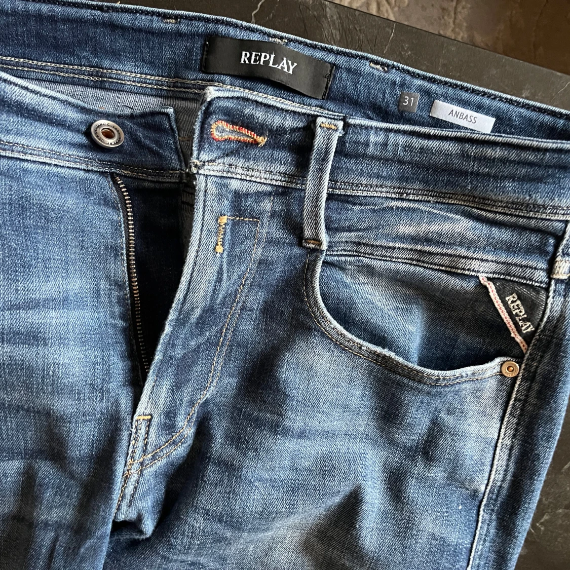 Snygga blå Replay Anbass jeans med klassisk femficksdesign och ljusa slitningar. Jeansen har normal passform, raka ben och detaljerade bakfickor med kontrastsömmar. Perfekta för dig som gillar en avslappnad men stilren look.