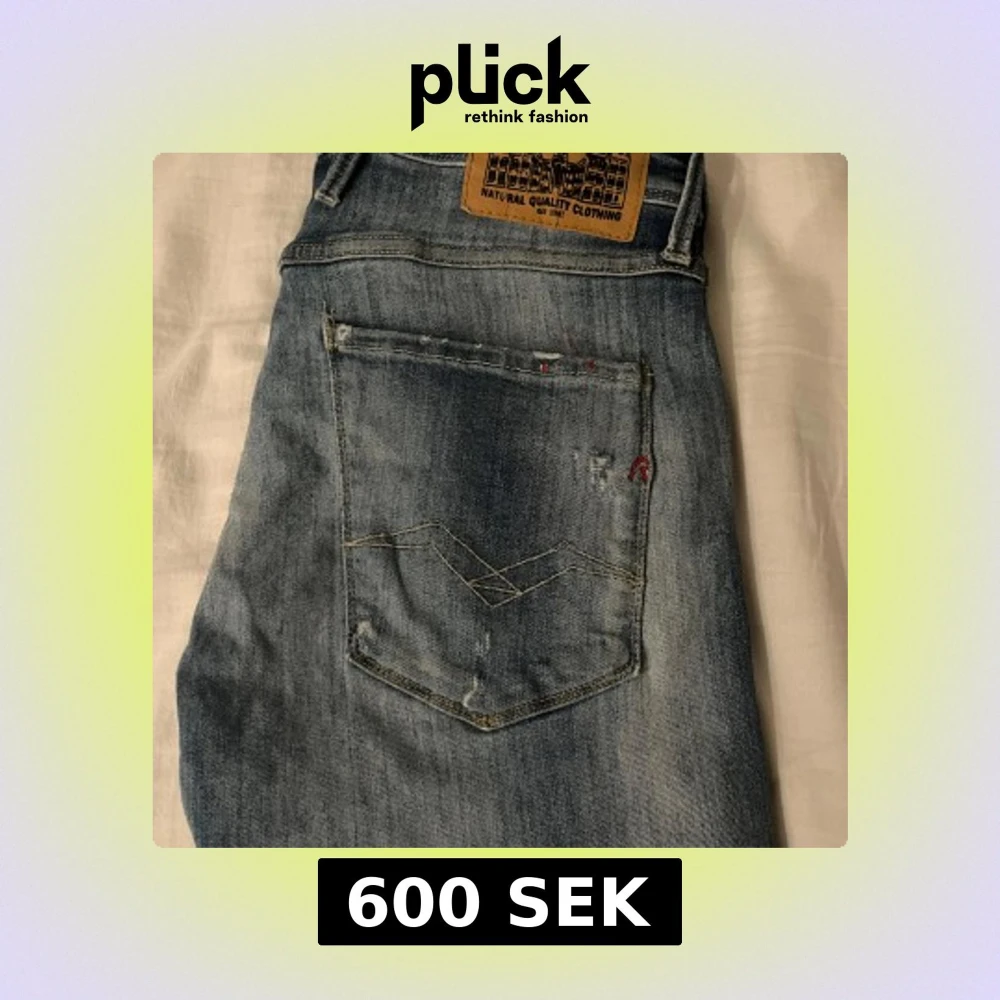 Säljer ett par blå Replay Anbass jeans med slitna detaljer och en cool, avslappnad look. De har en knappgylf och klassisk femficksdesign. Perfekta för en trendig stil! Priset kan diskuteras