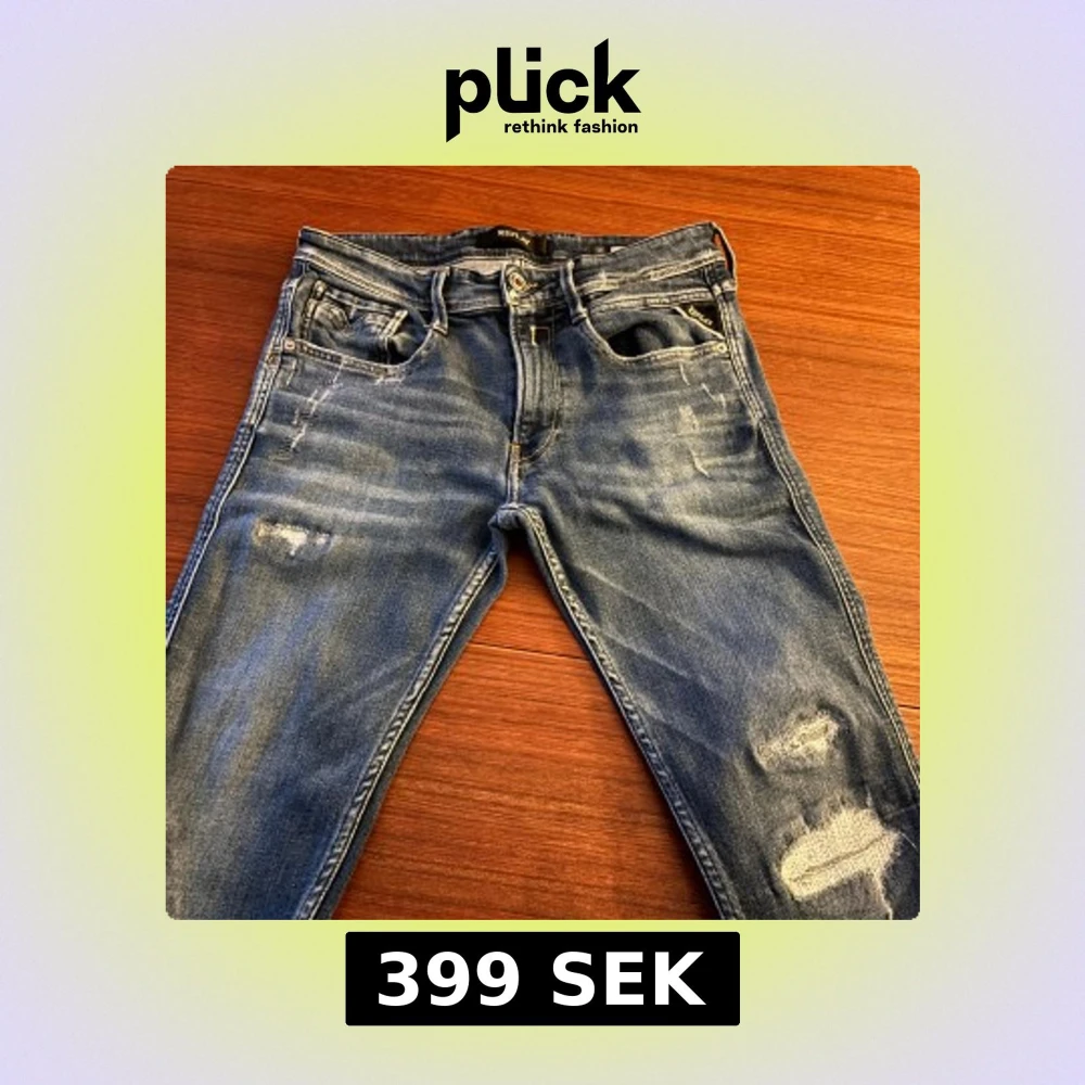 Snygga blå jeans från Replay med slitna detaljer och dragkedja. Perfekta för att klä upp sig lite snyggare, nypris runt 1800 vårat pris 399