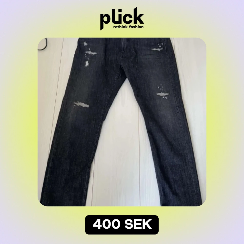 Säljer ett par svarta jeans med coola slitningar på framsidan. De har en straight passform och är perfekta för en avslappnad stil. Jeansen är i bra skick och passar till både vardag och fest.