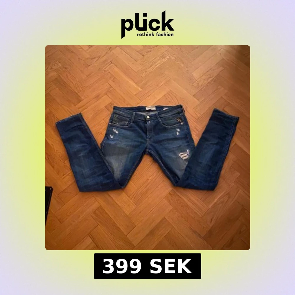 Snygga blå jeans från Replay med coola slitningar och klassisk femficksdesign. Jeansen har en normal passform och raka ben, med detaljer som ljusa tvättade partier och Replay-logga på bakfickan. Perfekta för dig som gillar en avslappnad streetstil.