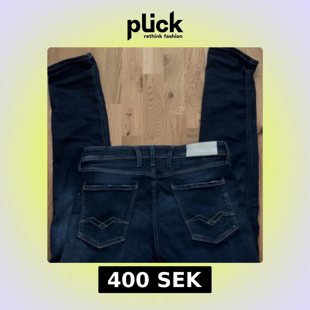 Säljer ett par mörkblå jeans från Replay med klassisk femficksdesign och snygga slitningar framtill. Storlek 32-34