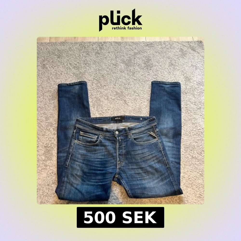 Snygga blå jeans från Replay med klassisk femficksdesign och raka ben. Jeansen har tydliga slitningar och kontrastsömmar, samt Replay-logga på fickan och läderpatch bak. Perfekta för en avslappnad och cool look.w32 och L34 och är i mycket bra skick.Priset kan diskuteras vid snabb affär