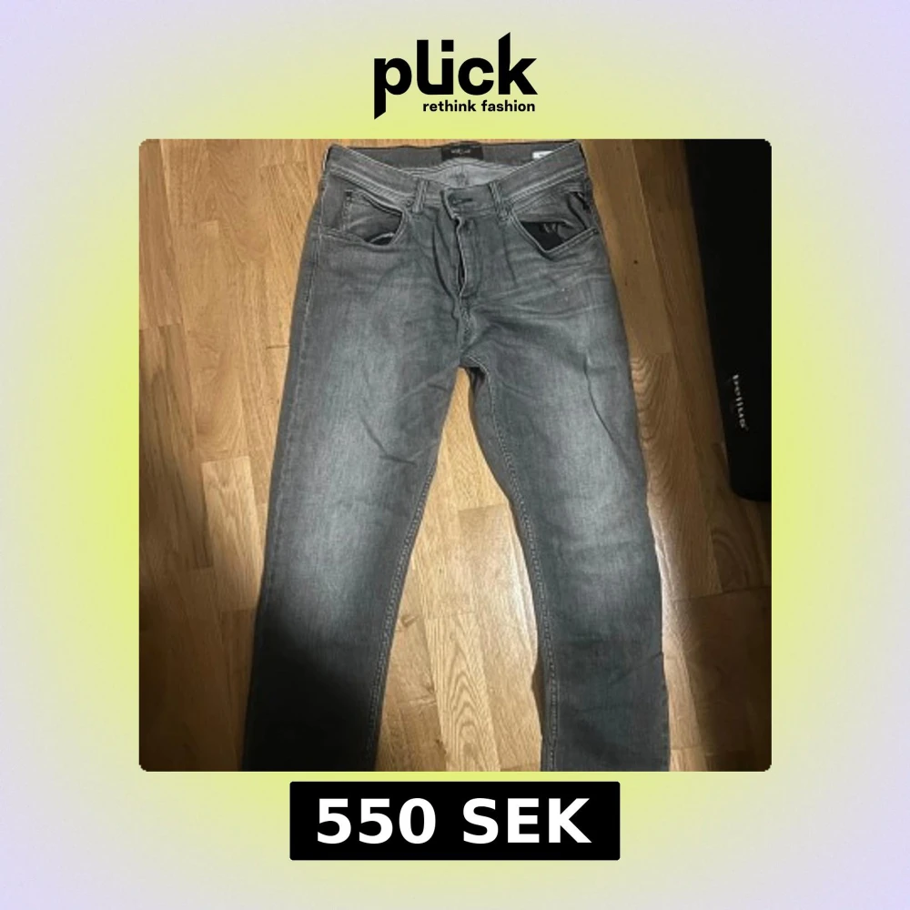 Säljer ett par grå jeans från Replay med klassisk femficksdesign och snygga detaljer på bakfickorna. Jeansen har en slim passform och är tillverkade i mjukt denimtyg som sitter skönt hela dagen. Perfekta för dig som gillar stilrena och moderna jeans.