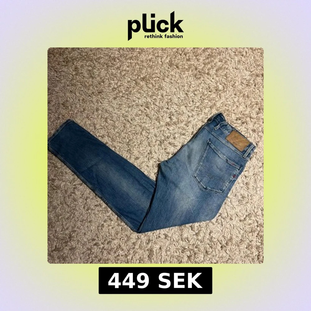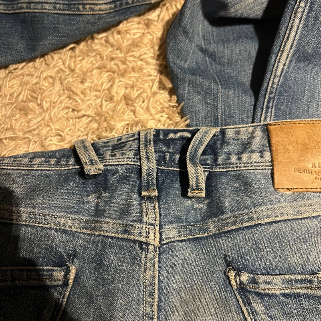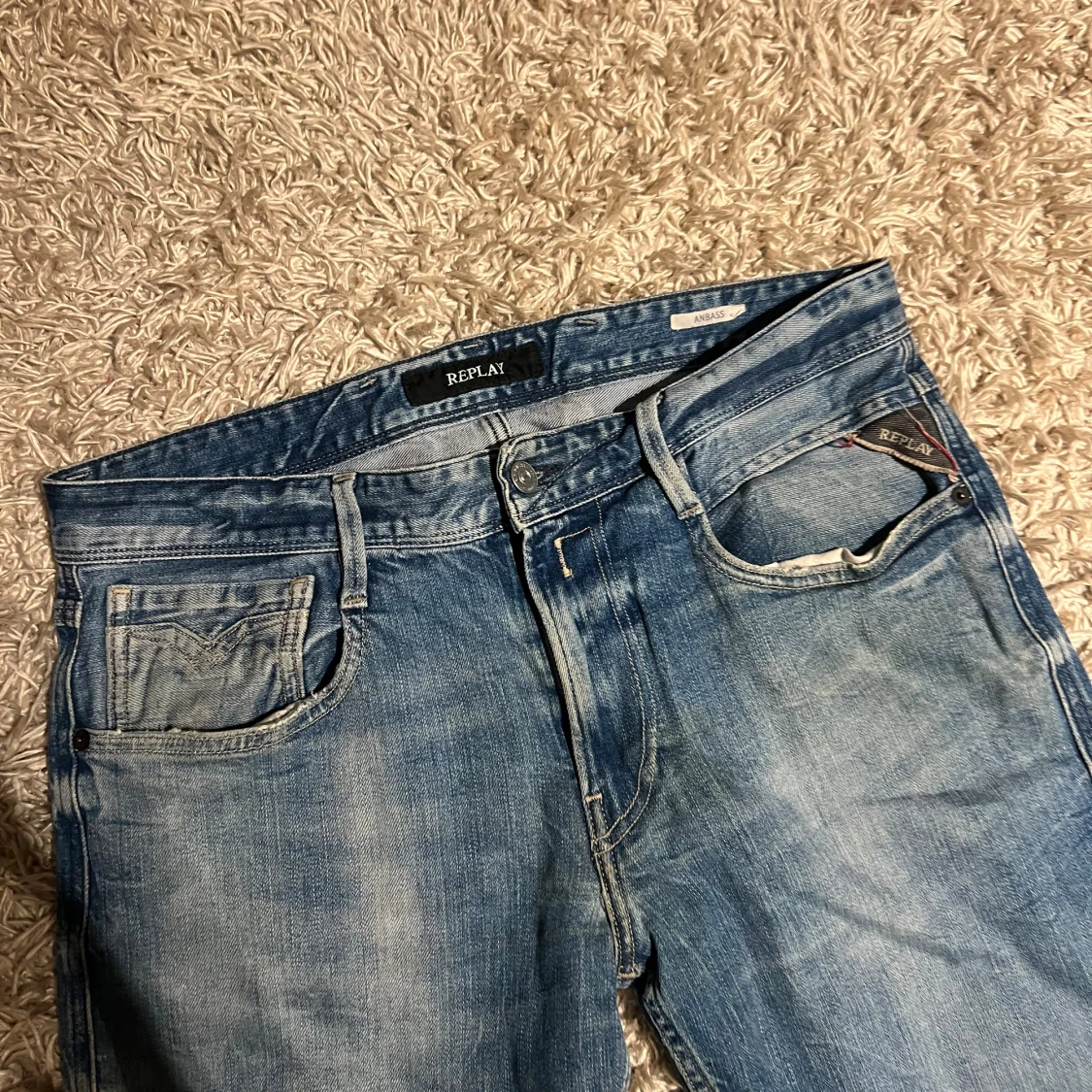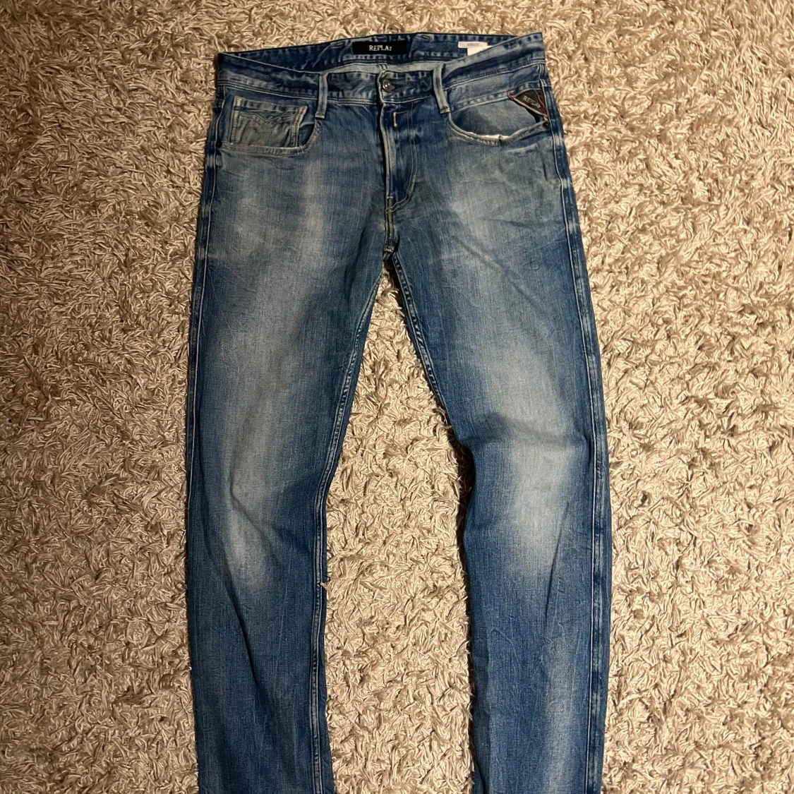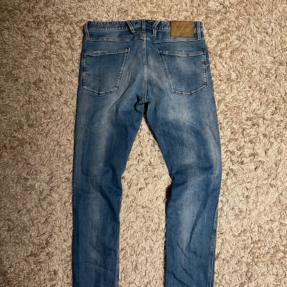Replay anbass jeans i slim passform. Storlek W32. Skön wash o små slitningar. Mycket bra skick övrigt, förutom två bälteshåller har lossnat nedifrån på baken, den i mitten fungerar, se bild. Postas samma dag som köp eller dagen därpå🙌💯