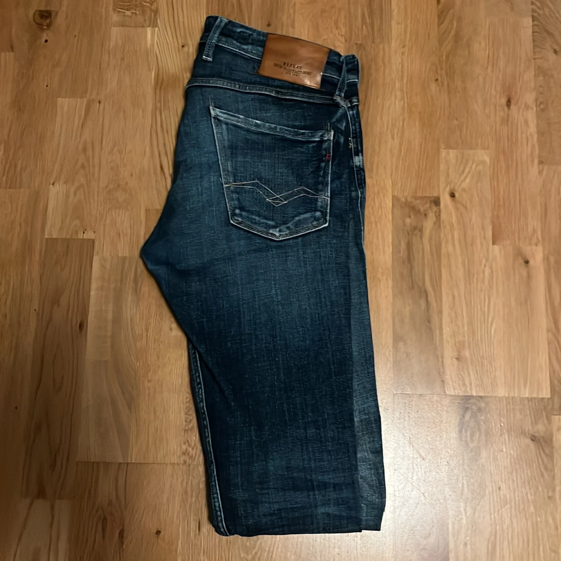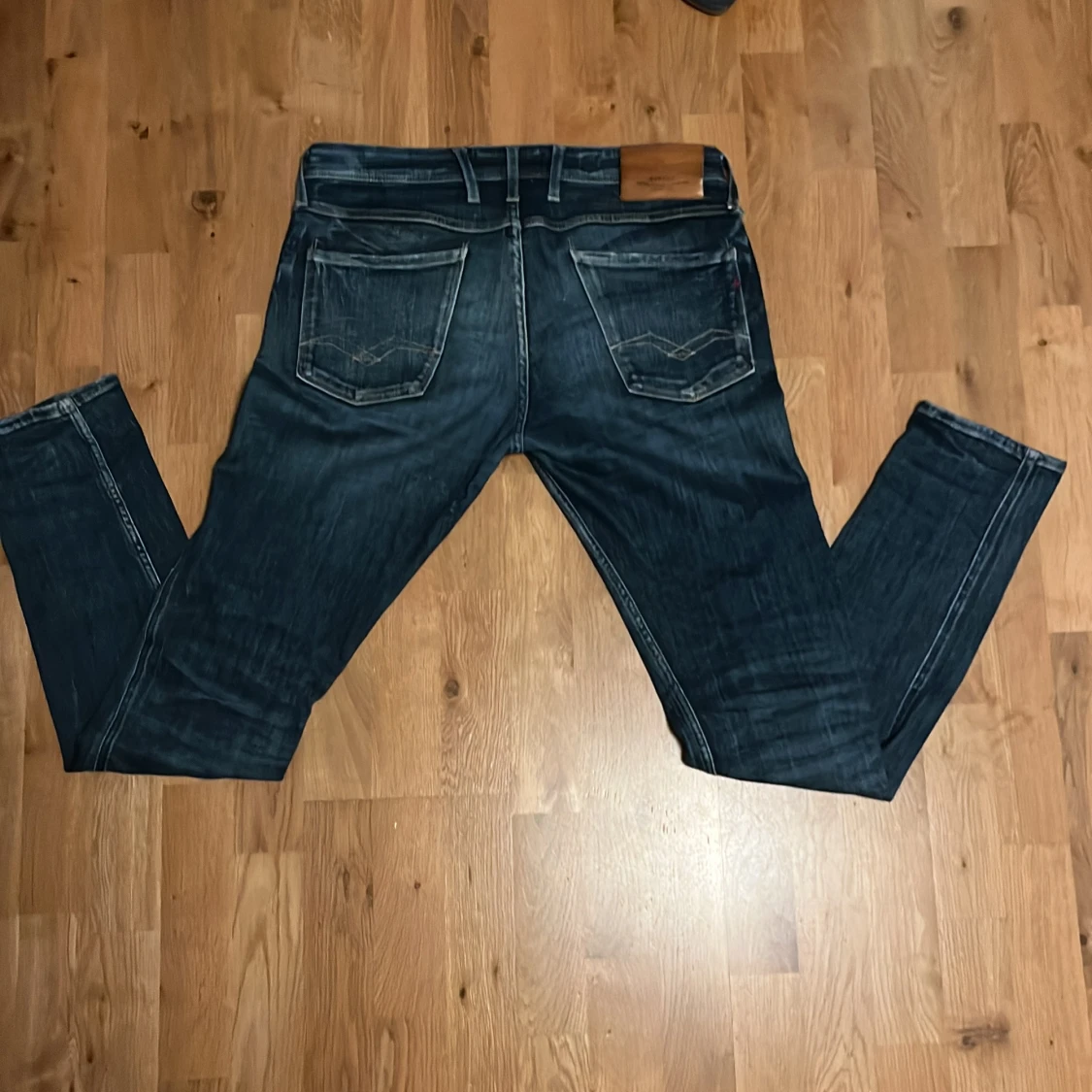 Snygga mörkblå jeans från Replay med slitna detaljer i ok skick. Nypriset ligger på runt 1900kr strlk 32:34