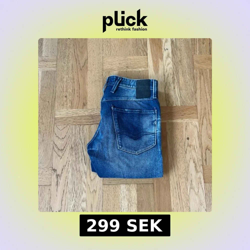 Snygga Replay Anbass jeans i klassisk blå tvätt med slitningar och ljusare partier. Modellen har fem fickor, normal midja och raka ben. Jeansen är tillverkade i mjukt denimtyg och har Replay-logga på bakfickan och läderpatch i midjan. Strl, 32,32