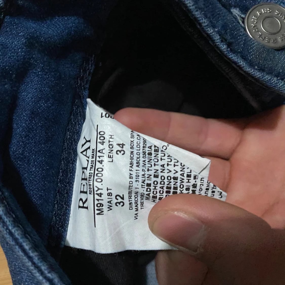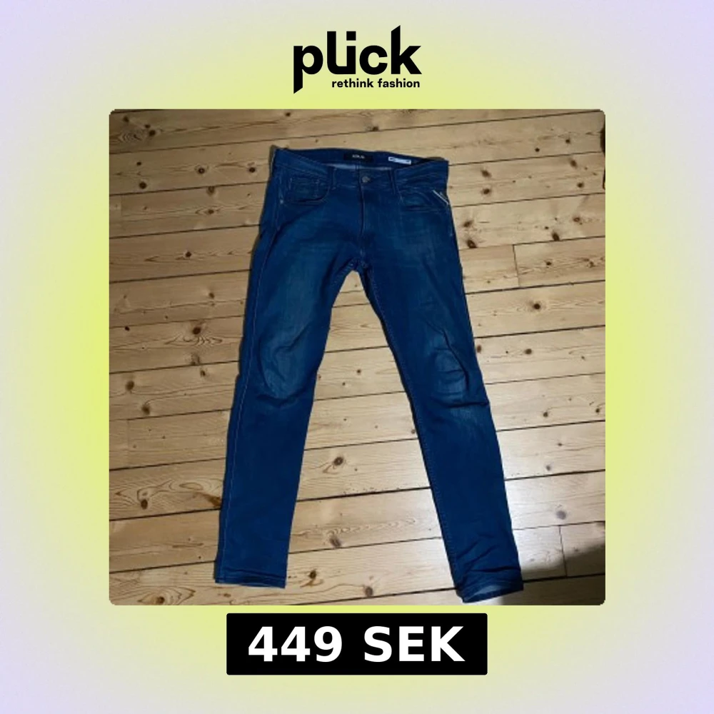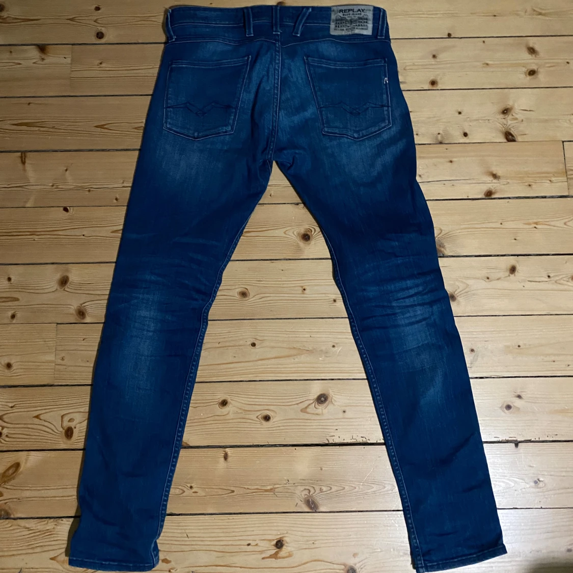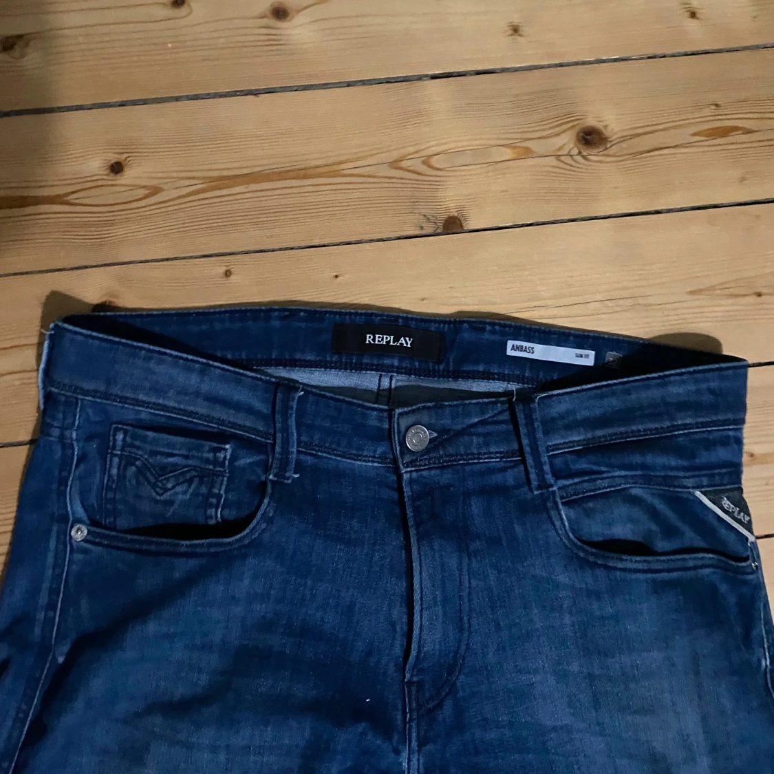Säljer ett par blå Replay Anbass jeans med klassisk femficksdesign och snygga slitningar. Jeansen har smal passform och raka ben, tillverkade i stretchig denim för extra komfort. De har även en snygg slitning vid grenen. Perfekta för dig som gillar en modern och stilren look. Även perfekta nu till hösten!🔥