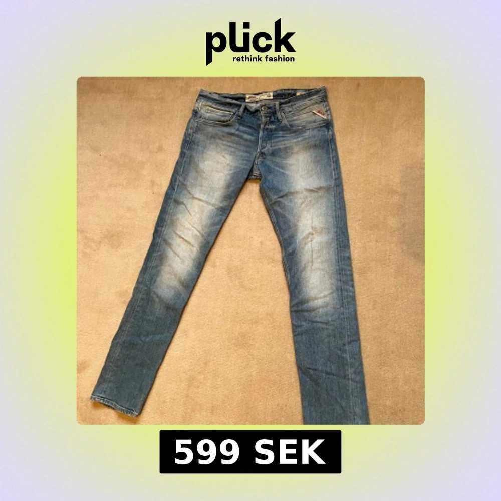 Snygga blå jeans från Replay med en klassisk femficksdesign och knappgylf. De har en lätt tvättad look och är perfekta för en avslappnad stil. Märkeslappen i läder baktill ger en extra touch av kvalitet. Jeansen är unika och varsamt använda. Säljes för hälften av originalpriset.
