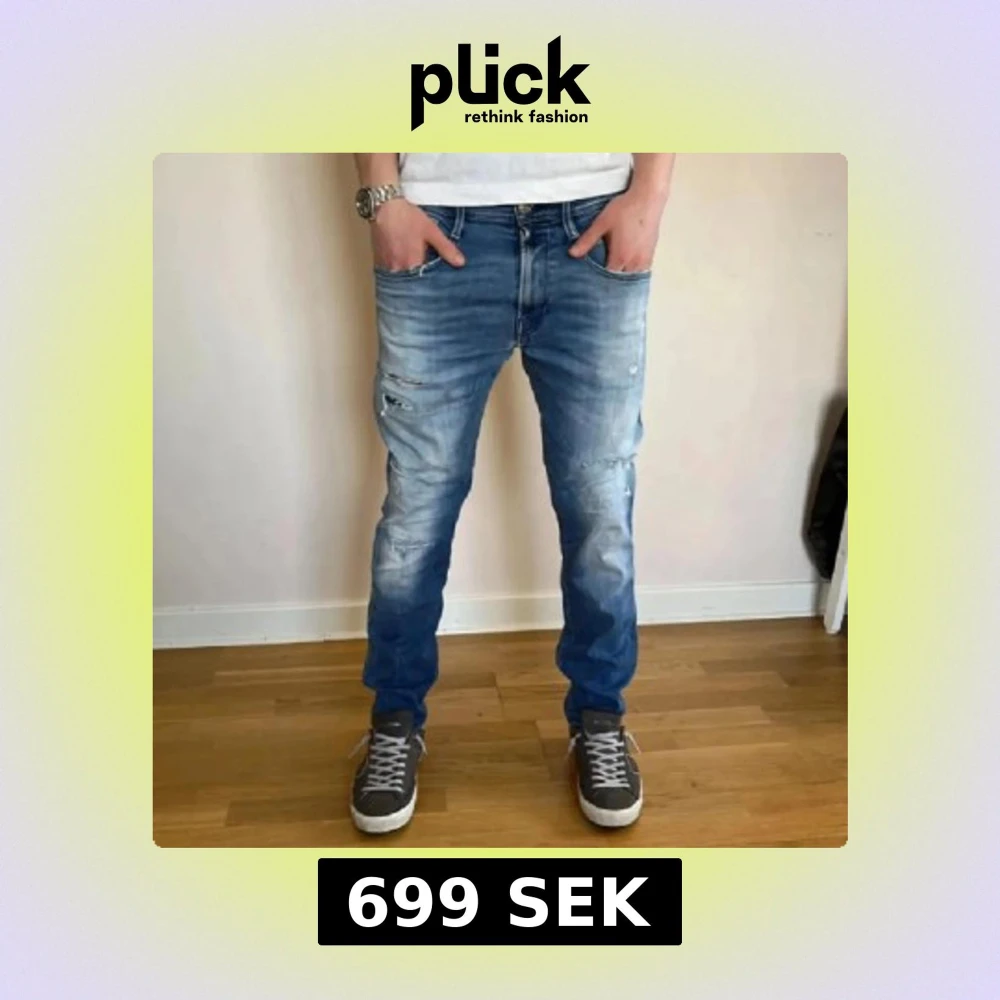 Ett par riktigt feta replay anbass jeans med slitningar. Dom är knappt använda inga skavanker eller liknande. Storleken är 33 men är ganska små i storleken så passar även 31